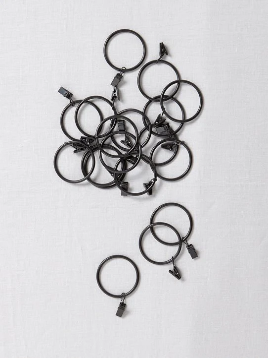Lot de 8 anneaux à pince en métal noir. Pour transformer une simple pièce de tissu en rideau tendance. Une idée déco facile et pratique.