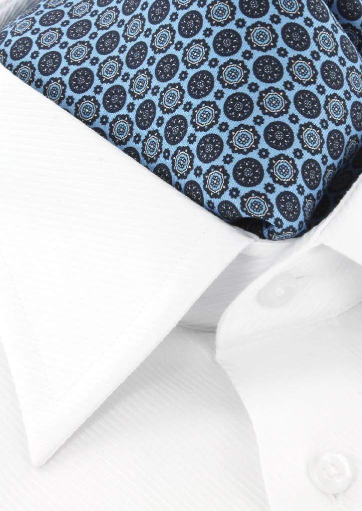 Ascot homme 100 % soie de couleur bleu ciel à motifs rosace. Cet ascot de la marque Cotton Park est d’une largeur de 16 cm et d’une longueur de 136 cm.