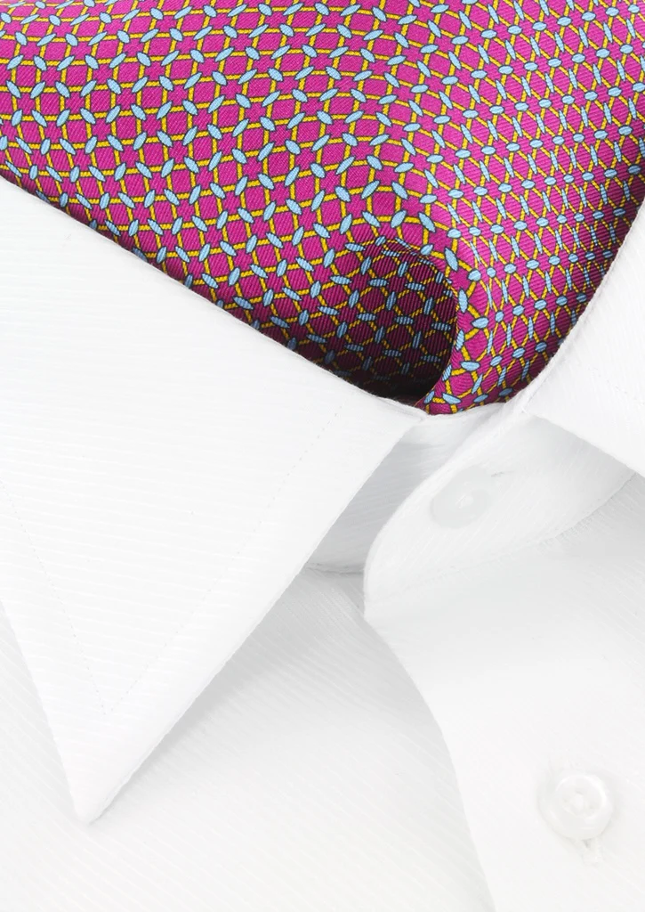 Ascot homme 100 % soie de couleur fuchsia à motifs bleu ciel et jaunes. Cet ascot de la marque Cotton Park est d’une largeur de 16 cm et d’une longueur de 136 cm.