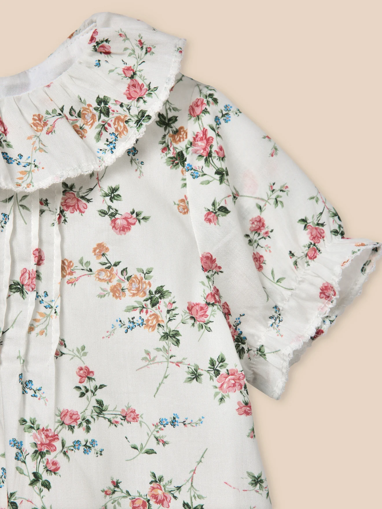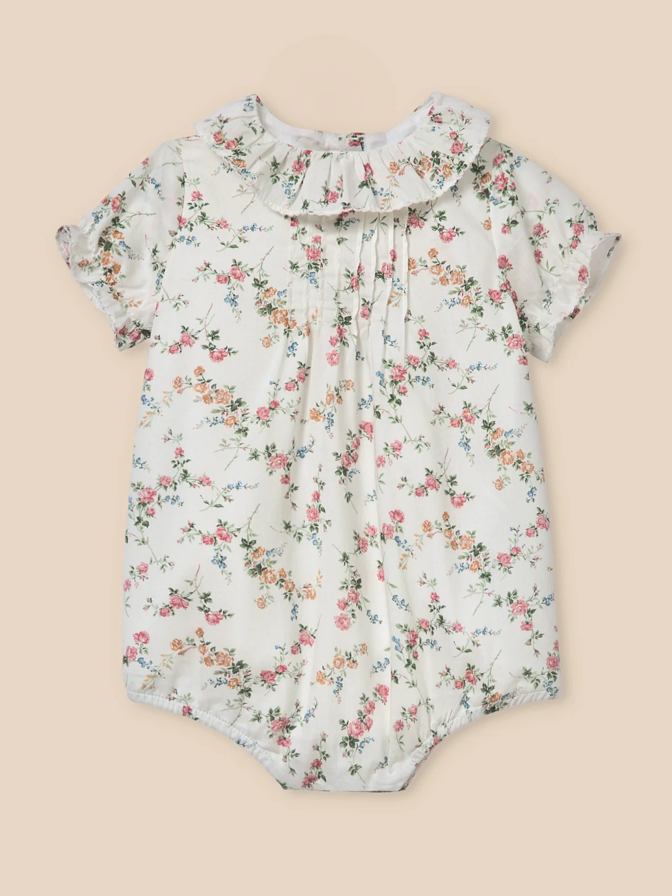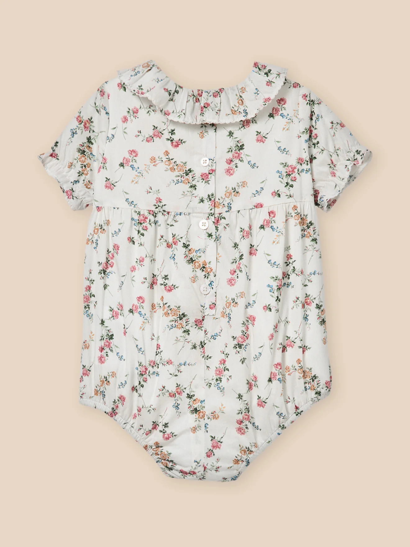 Une barboteuse en tissu Liberty Elisabeth, au charme rétro et à la coupe délicatement travaillée. Col volanté. Plis religieux, finition picots. Manches courtes élastiquées Ouverture au dos par boutons. Pressions à l’entrejambe Cuisses élastiquées