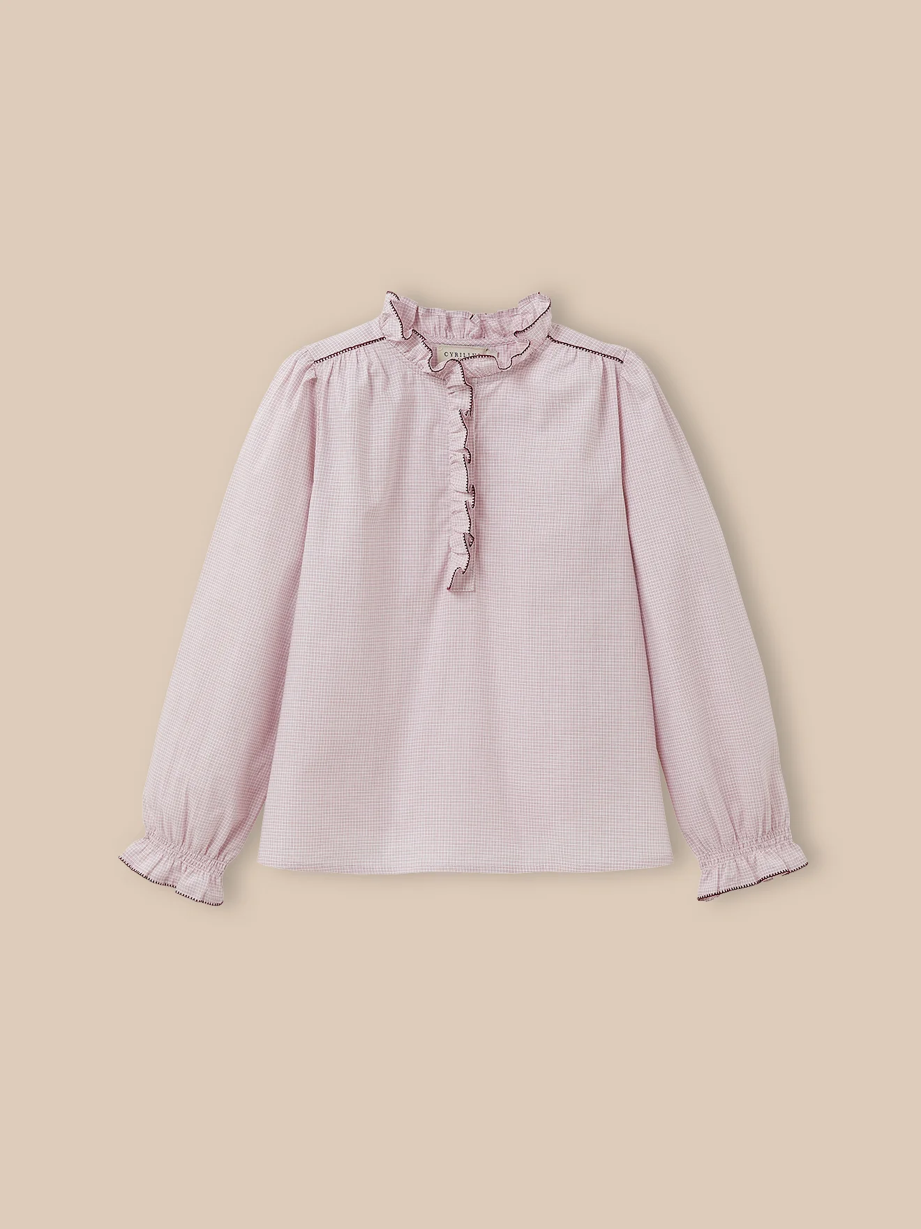 Une blouse pas comme les autres, avec son motif en micro-carreaux, son point brodé fantaisie et ses petits volants. Patte de boutonnage cachée sous le volant Poignets élastisqués