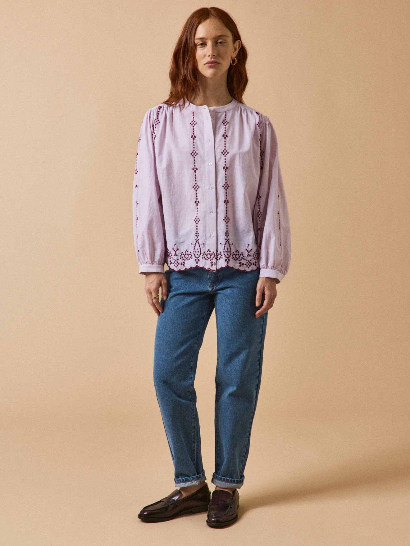 Mélange d’inspiration vintage, de pièce raffinée et d’esprit bohème, la blouse cultive les beaux détails brodés… Sur un tissu micro carreaux tissé-teint et dans des tonalités profondes.