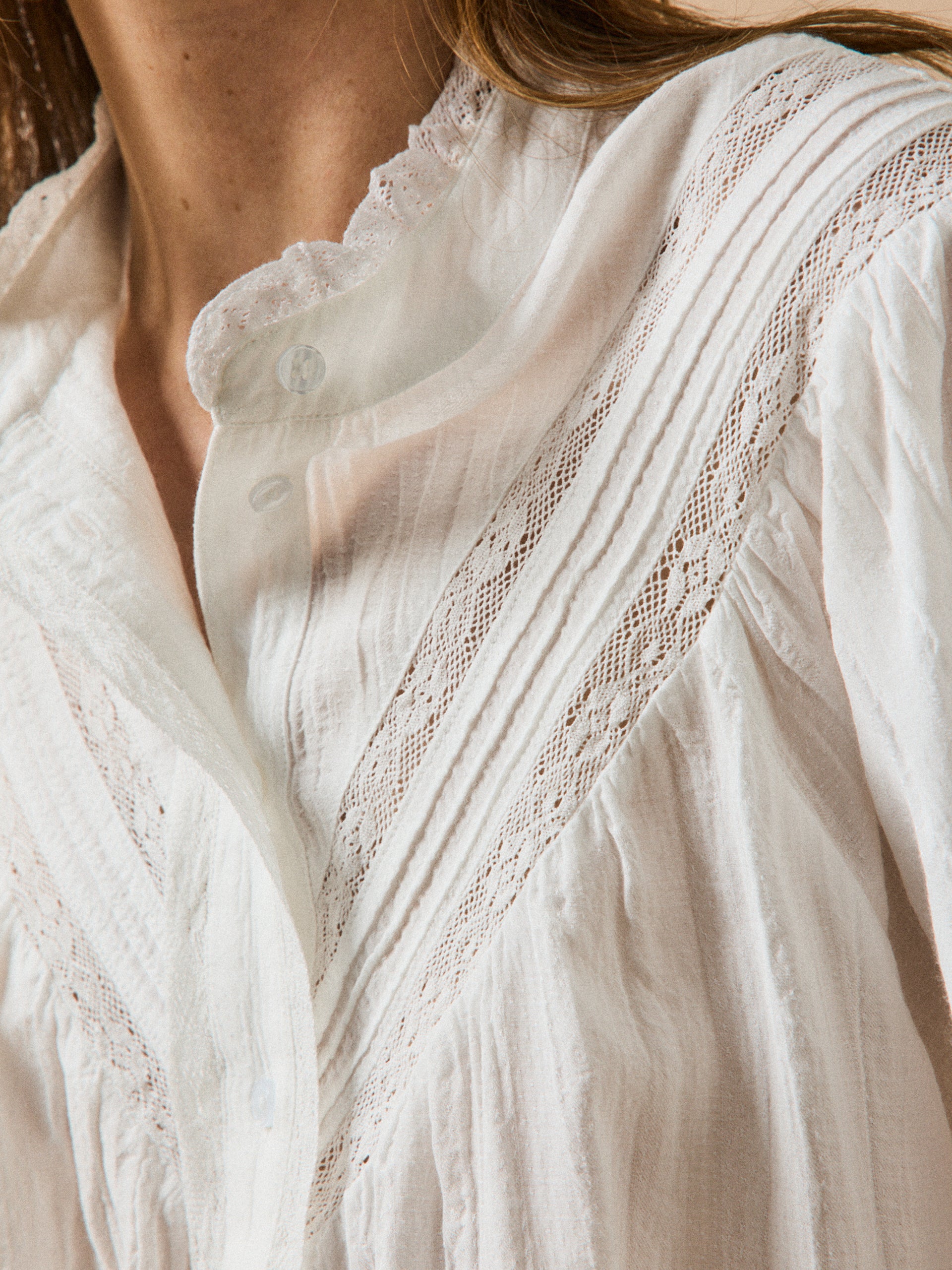 - Finition dentelle au col rond, à la patte de boutonnage et en V devant/dos avec plis piqués