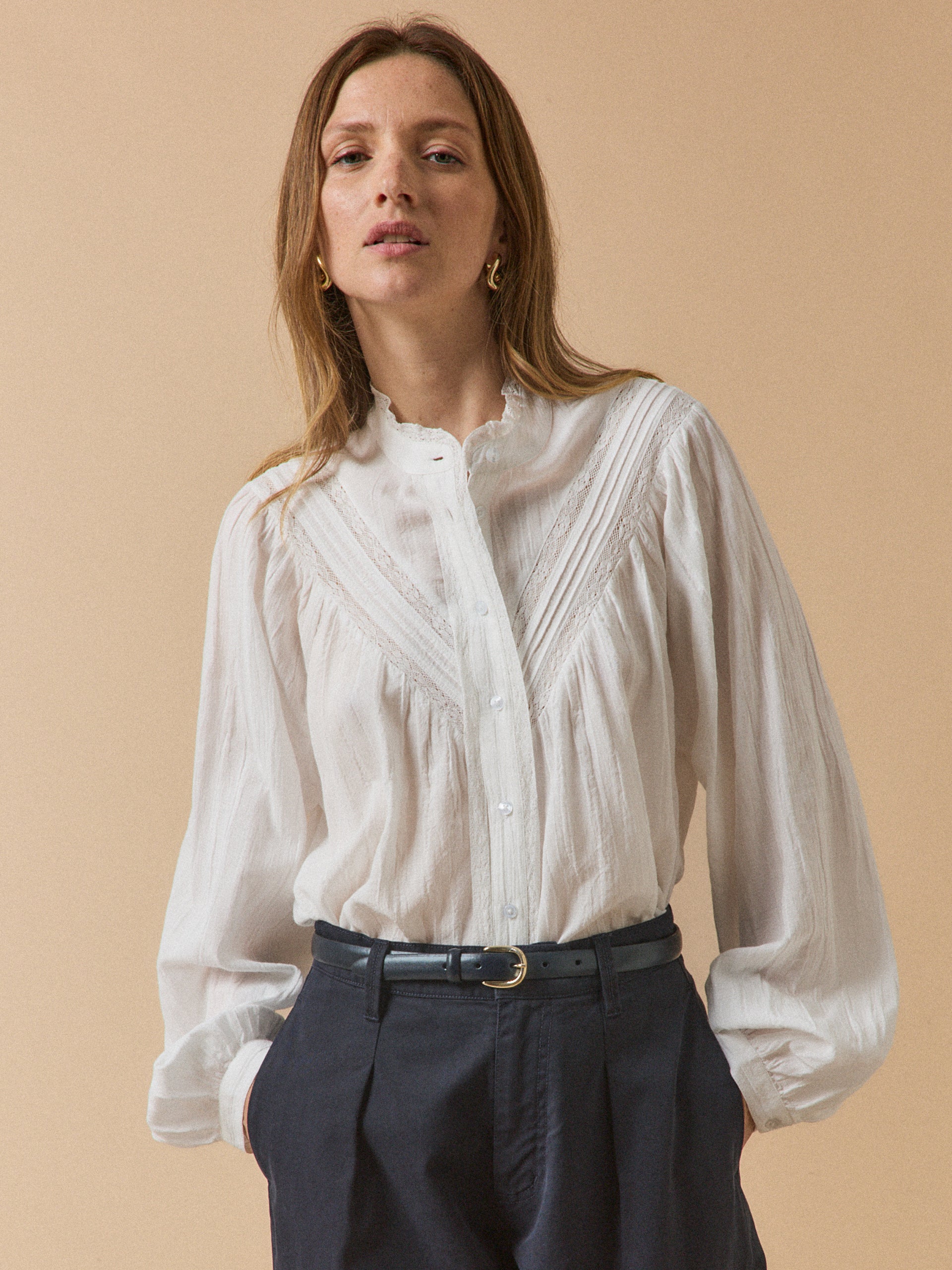 Une douce matière brodée, des détails de dentelle et des jeux de plis qui changent tout ! Même en mode romantique, la blouse assure un style cool et une allure tendance.