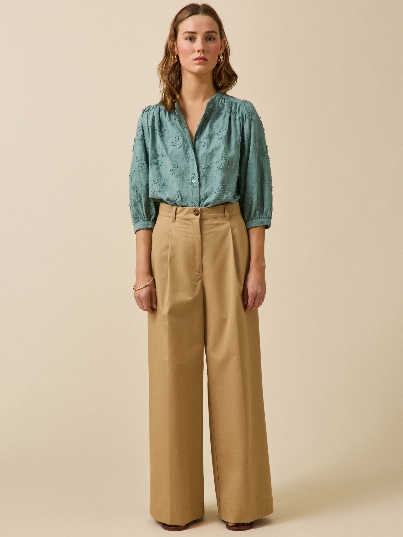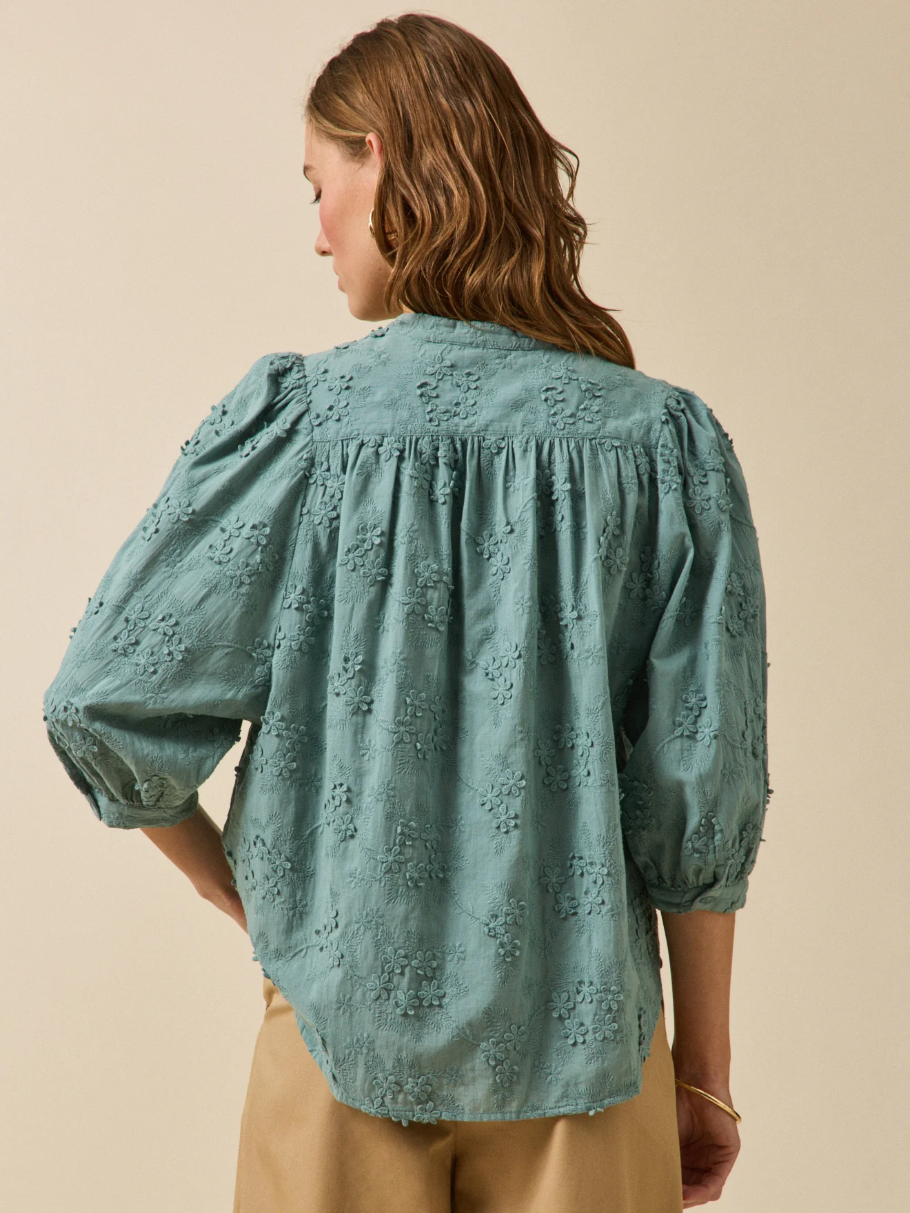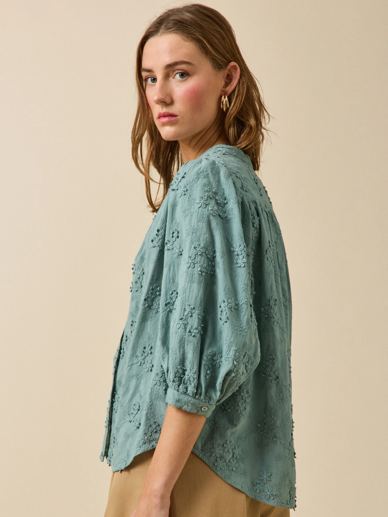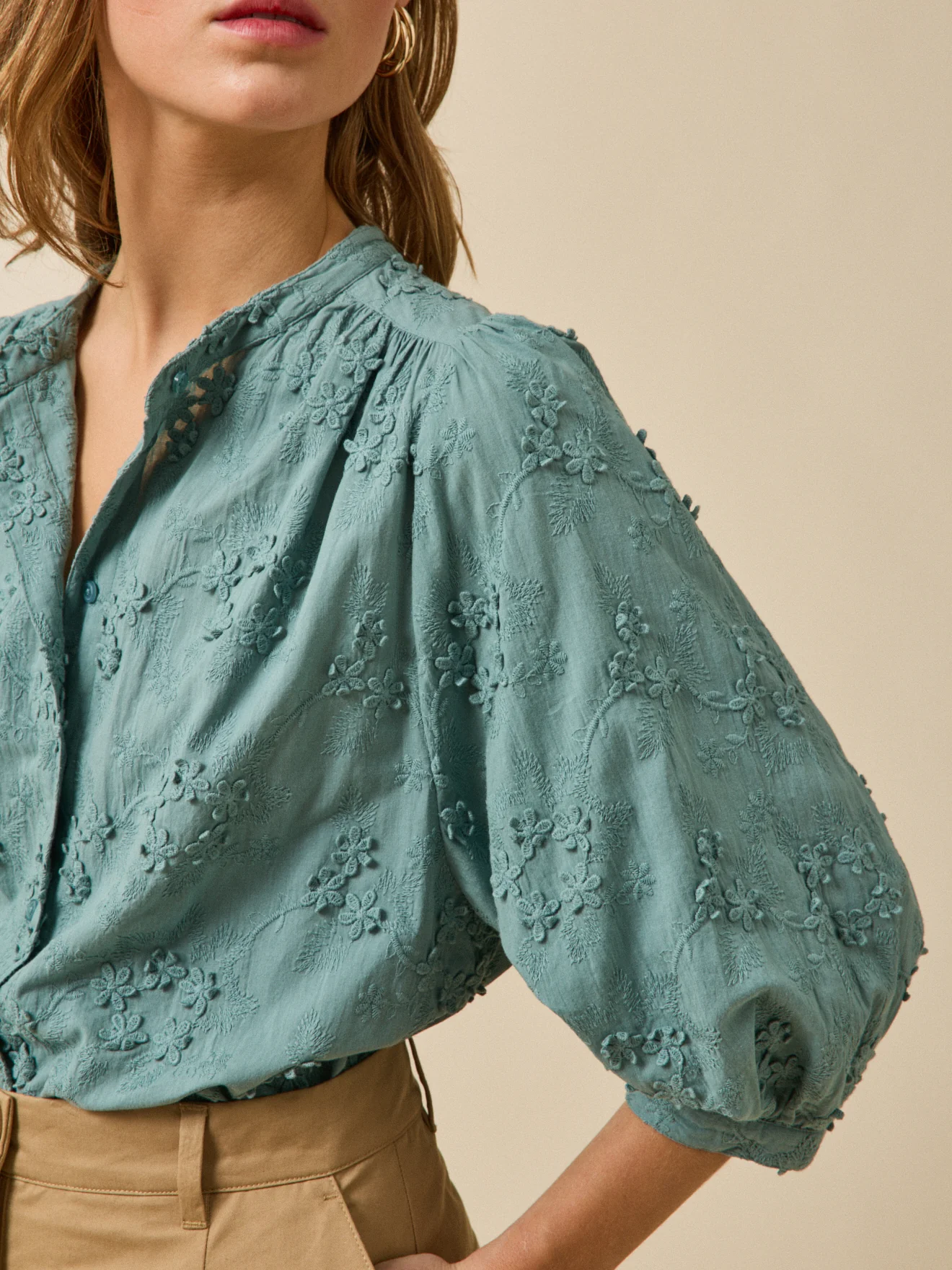 - Manches 3/4 blousantes et montées sur fronces, bracelets boutonnés