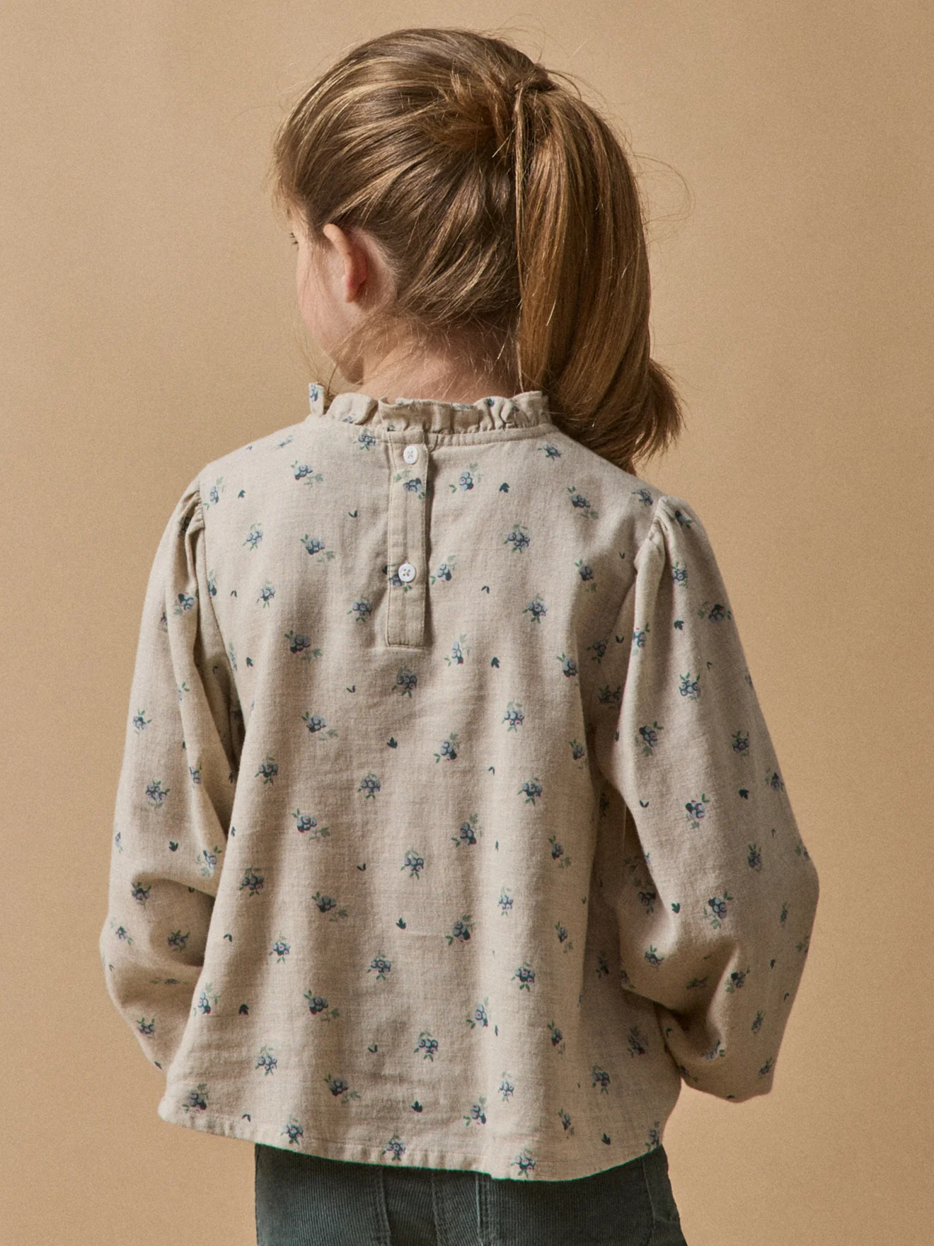 Cette blouse en flanelle de coton séduit par son col volanté et ses plis religieuse.
