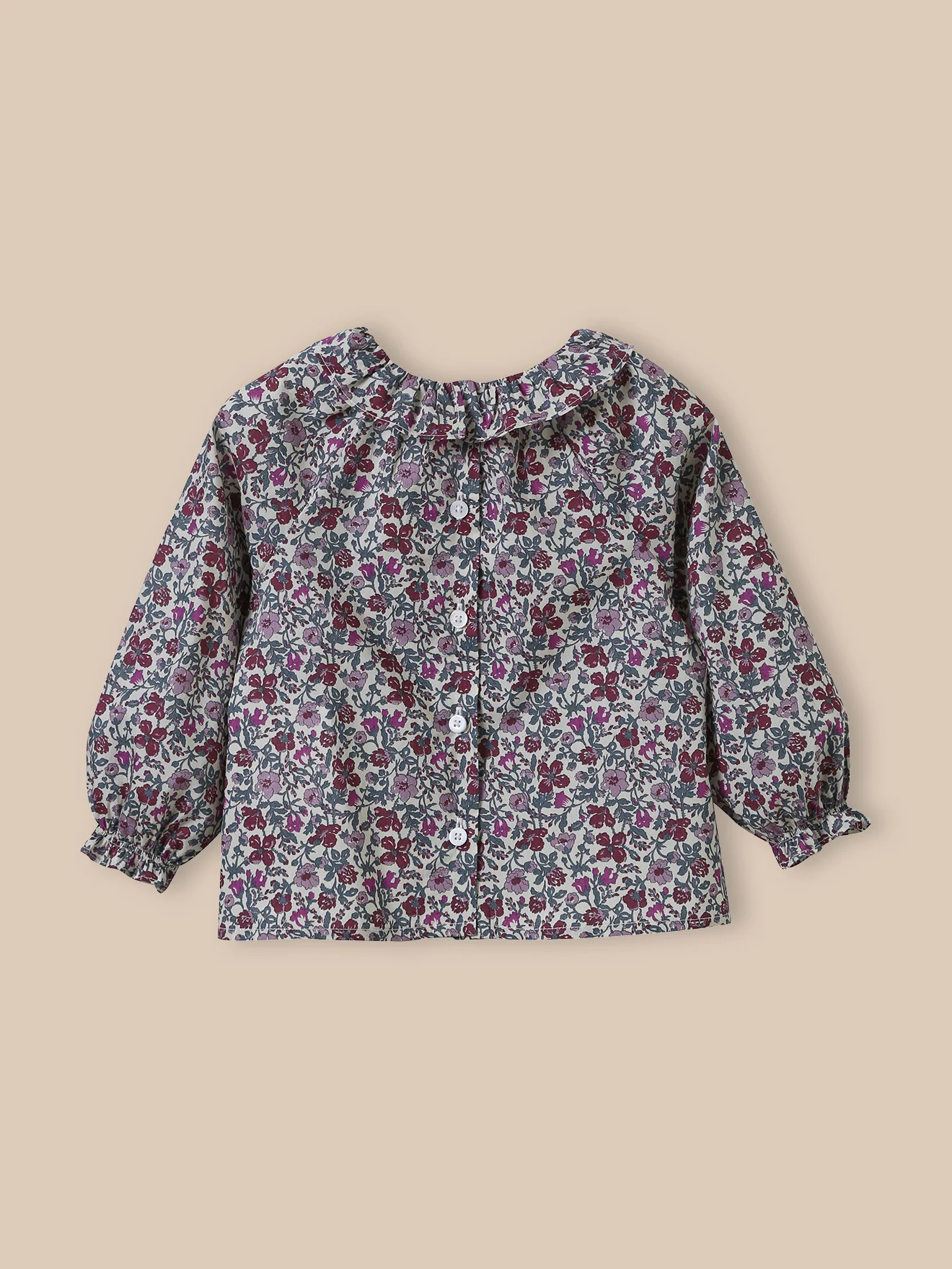 Un tissu Liberty au motif dense et aux belles tonalités automnales. Le tissu Liberty Babingdon est également disponible sur d’autres pièces de nos collections. Fine dentelle au col volanté. Poignets élastiqués Ouverture dos par boutons