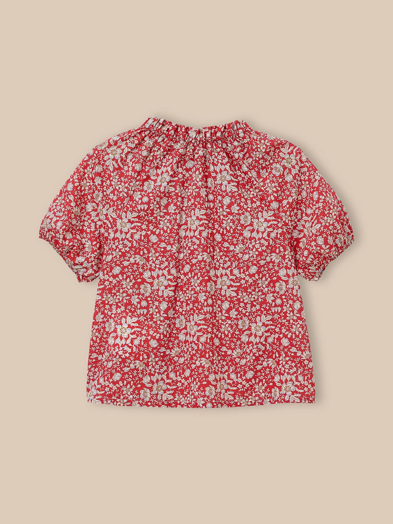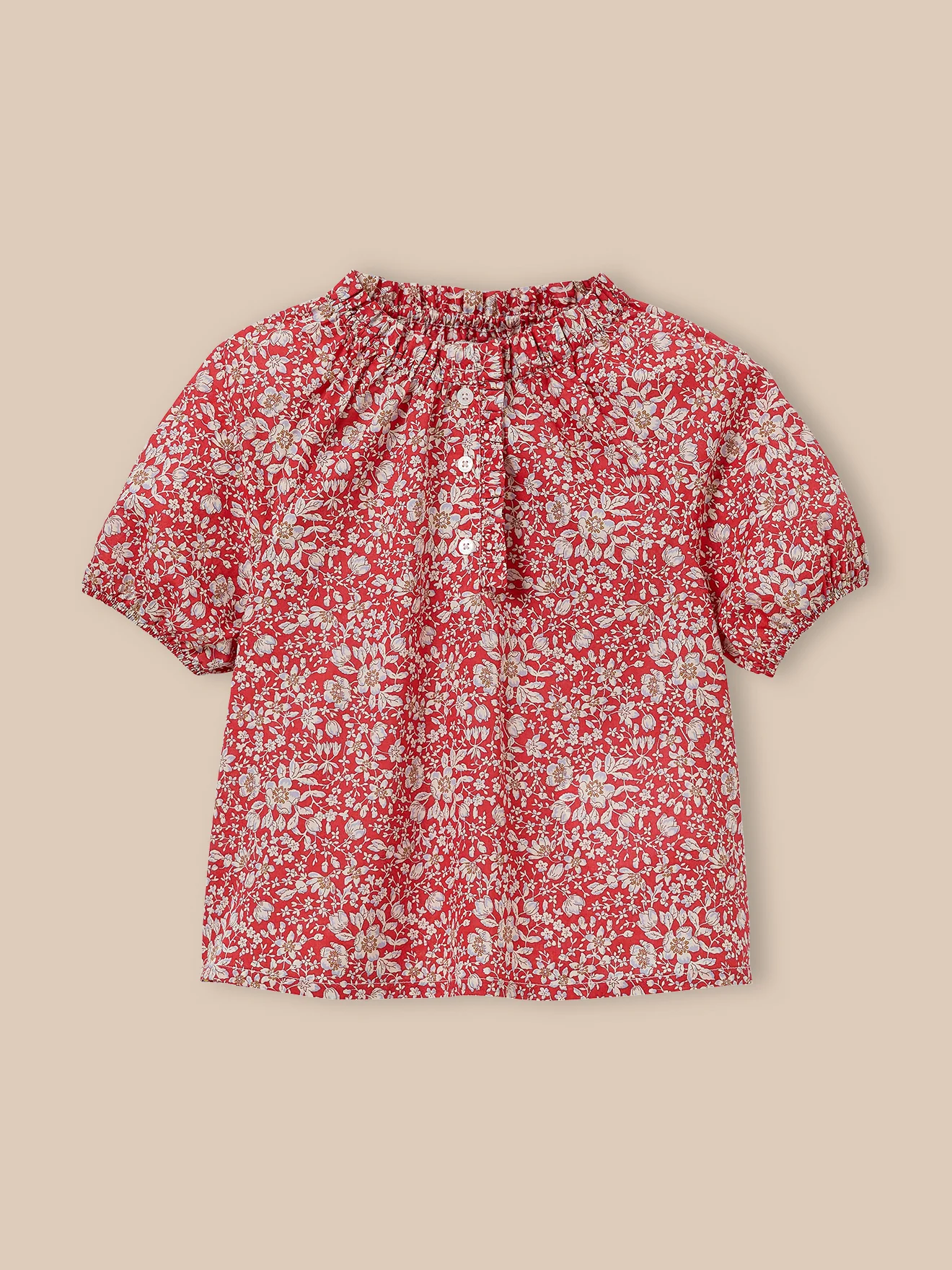 Une blouse raffinée en tissu Liberty Lizzy. Petites fronces sous l’encolure ronde Ouverture boutonnée Manches ballon élastiquées