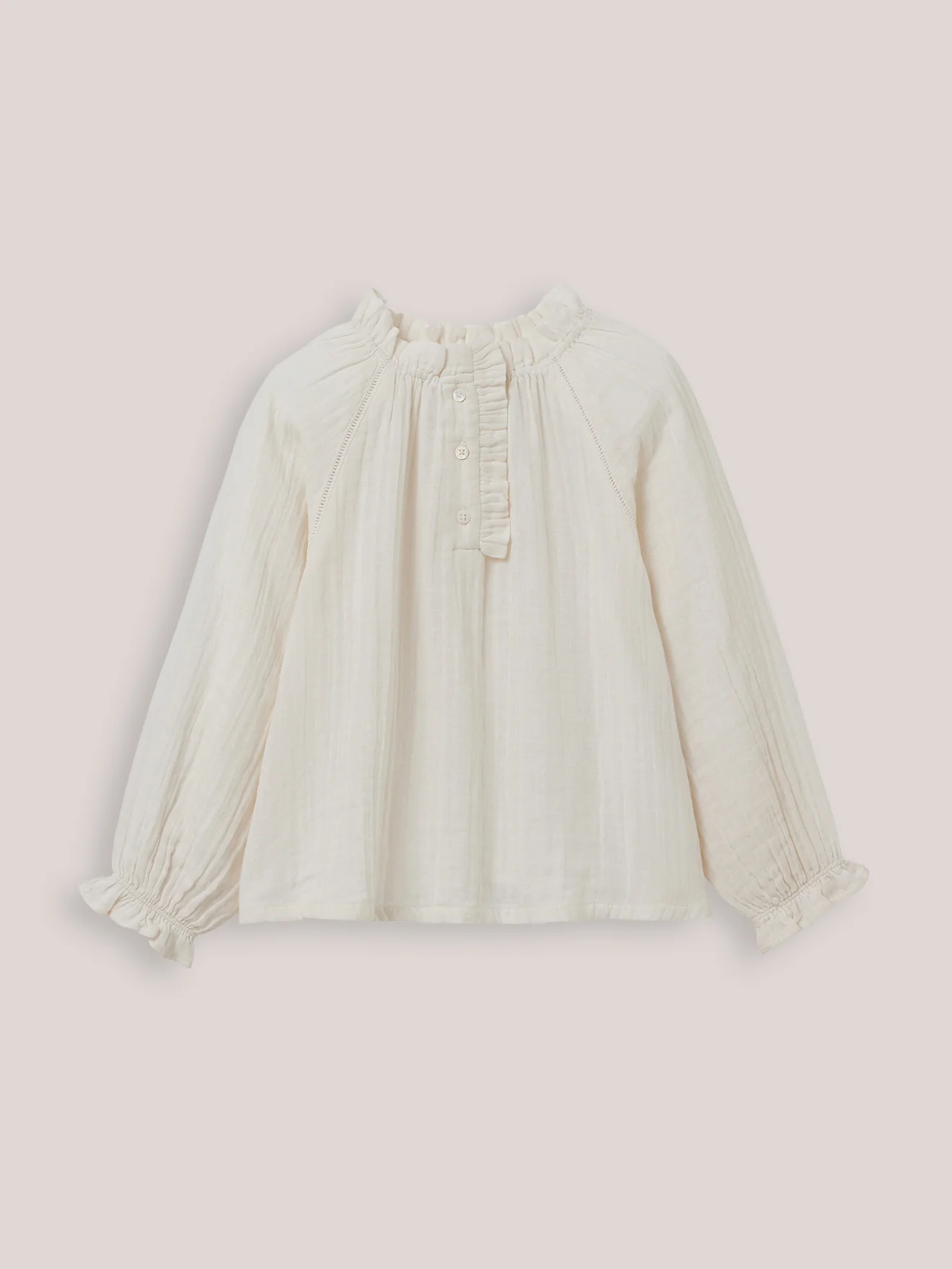 Larges manches bouffantes, jours échelle incrustés et détails volantés. Cette blouse en gaze de coton offre un petit look cool et raffiné.