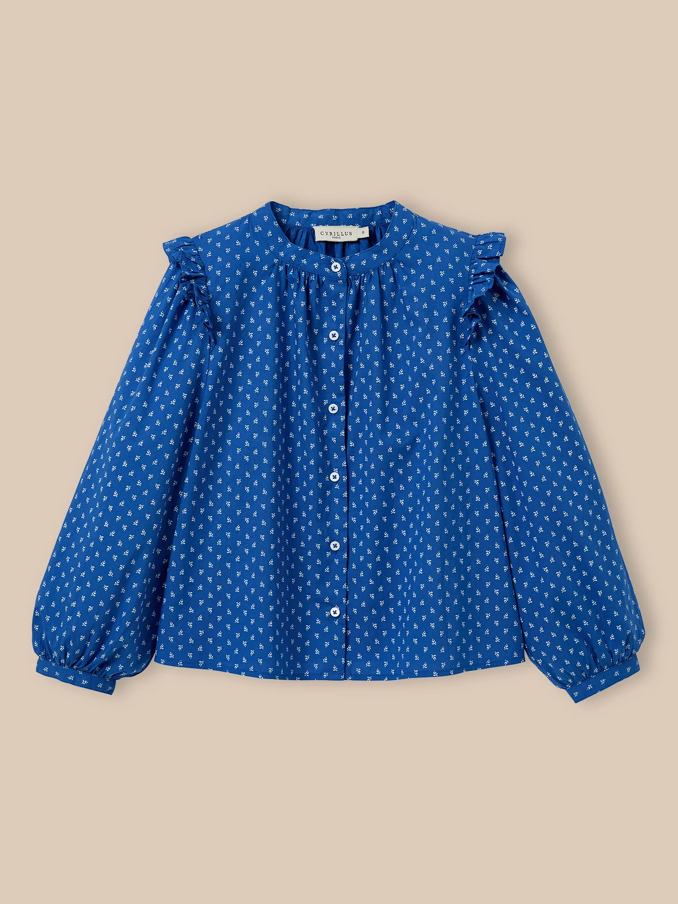 Un bleu lumineux, un imprimé délicat et un volant aux épaules pour cette blouse ample.
