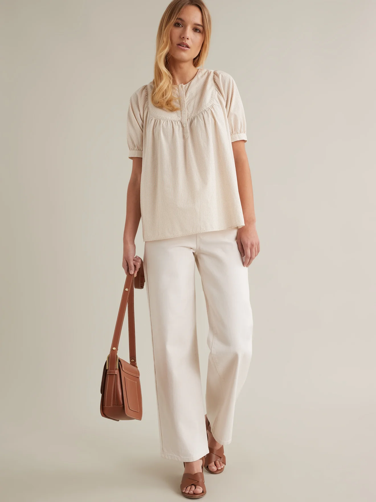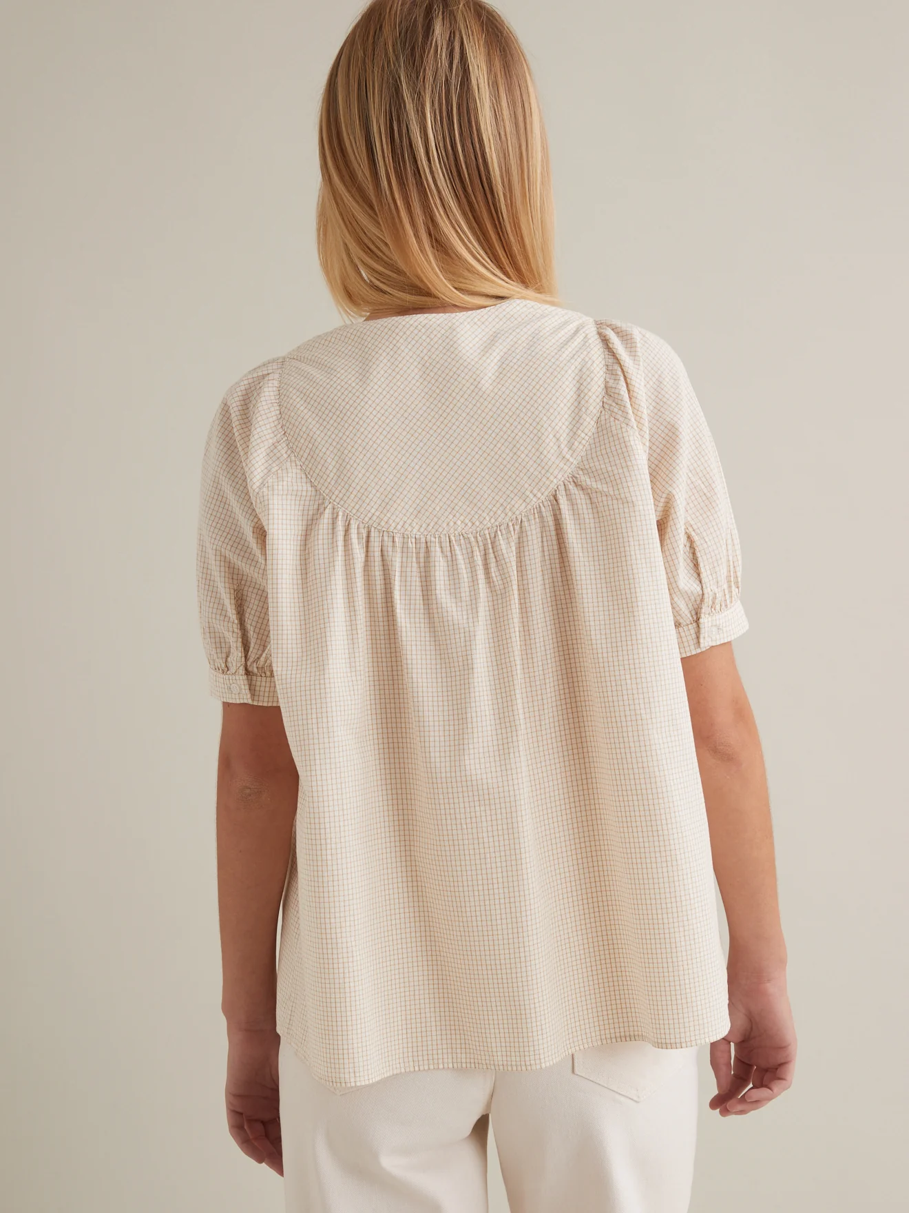 Fin quadrillage, jaune tendre, douce ampleur et pur coton. La blouse joue la délicatesse sur un volume très féminin. Des carreaux à retrouver en version bébé pour un duo maman/bébé chic et charme.