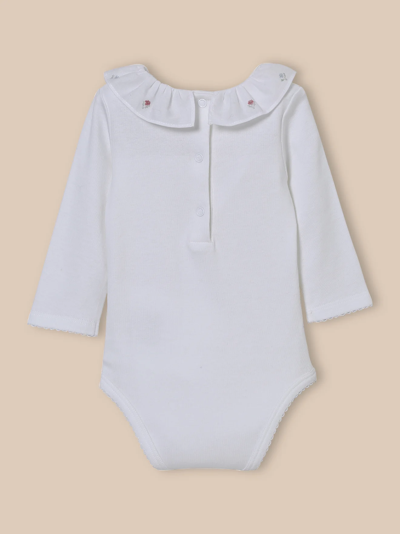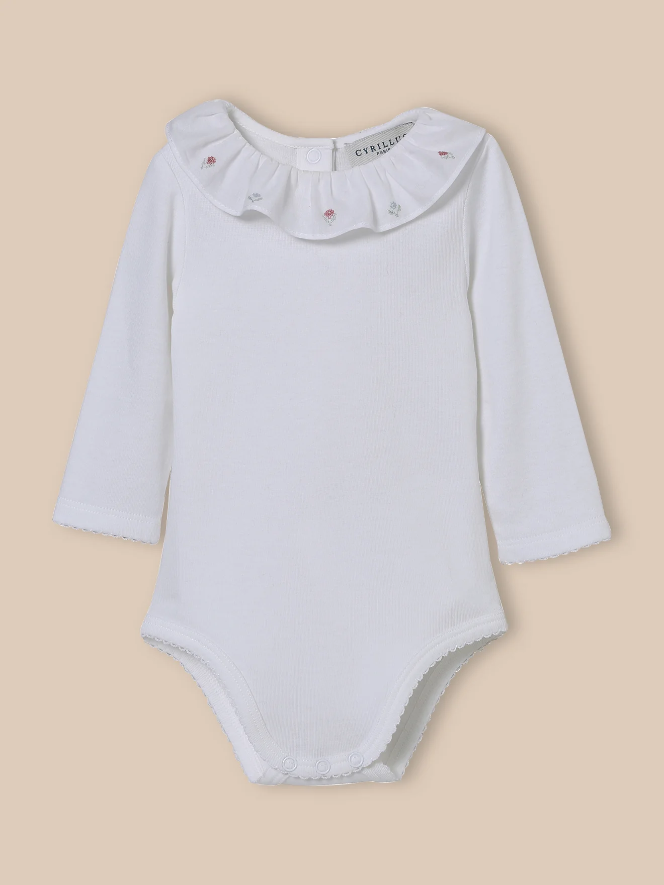 Body raffiné orné d’un col en voile volanté, délicatement brodé à la main. Une broderie réalisée à la main par nos partenaire de Madagascar. Collerette brodée à la main Ouverture pressionnée au dos et à l’entrejambe pour un habillage facilité Pensées pour durer, nos pressions sont pratiques et résistantes