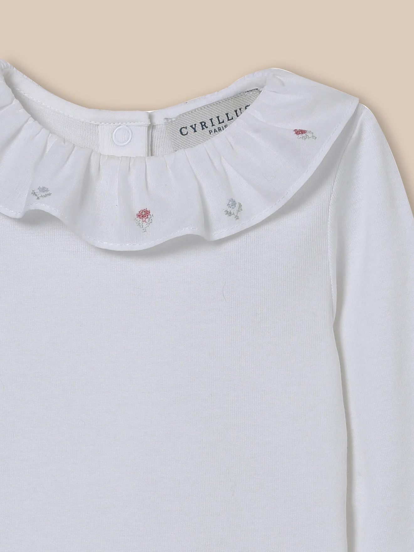Body raffiné orné d’un col en voile volanté, délicatement brodé à la main. Une broderie réalisée à la main par nos partenaire de Madagascar.