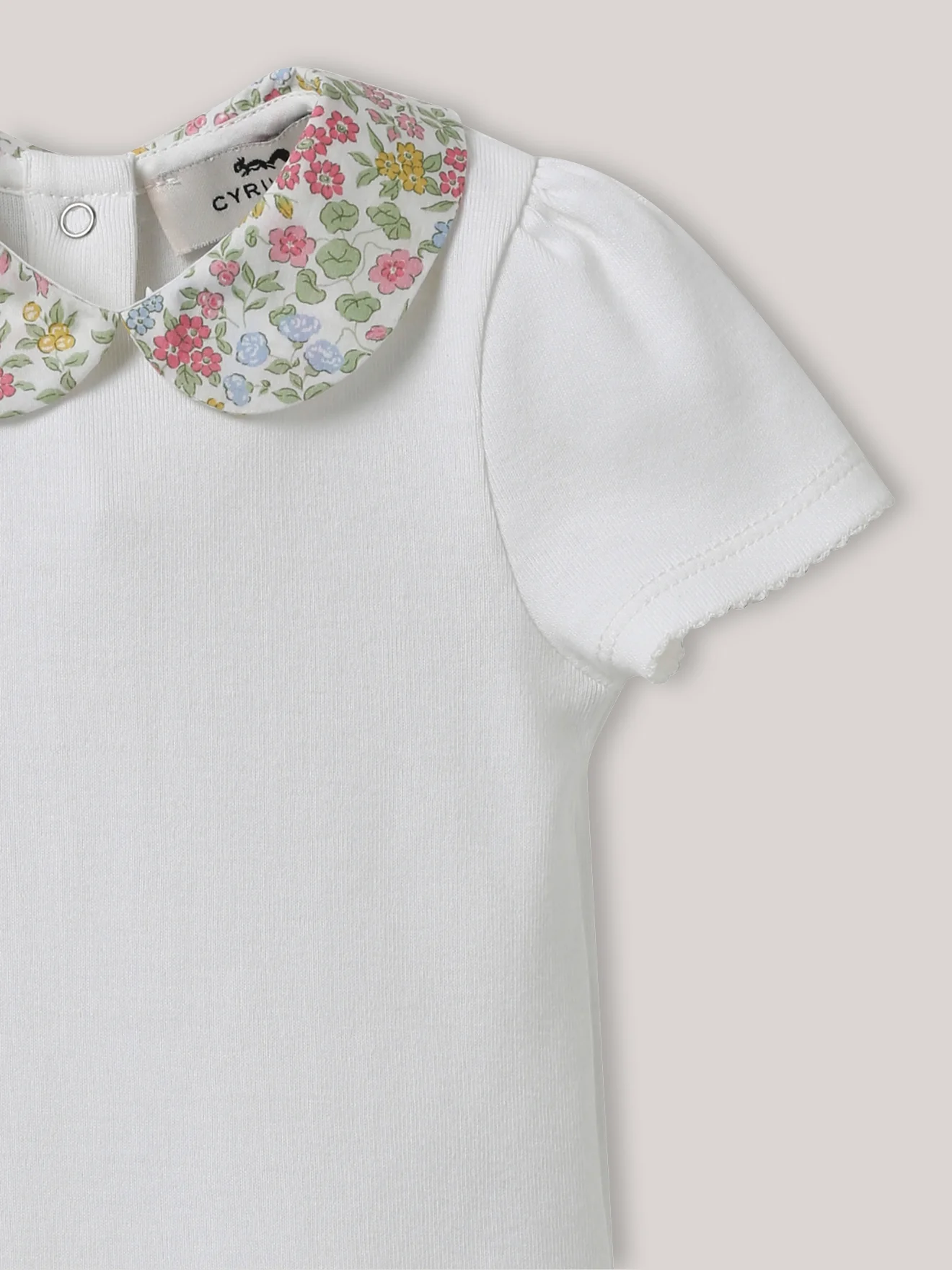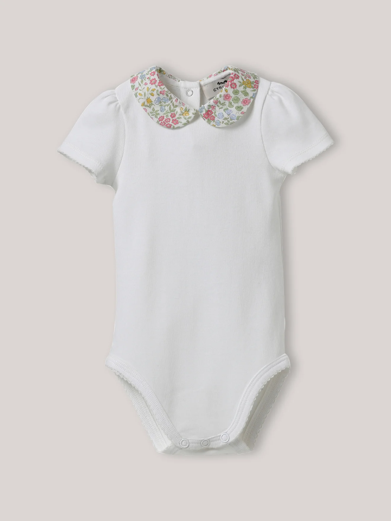 Un essentiel revisité avec élégance par un col en tissu Liberty. Un détail raffiné qui apporte une touche délicate et intemporelle, parfait pour sublimer les premières tenues de bébé.