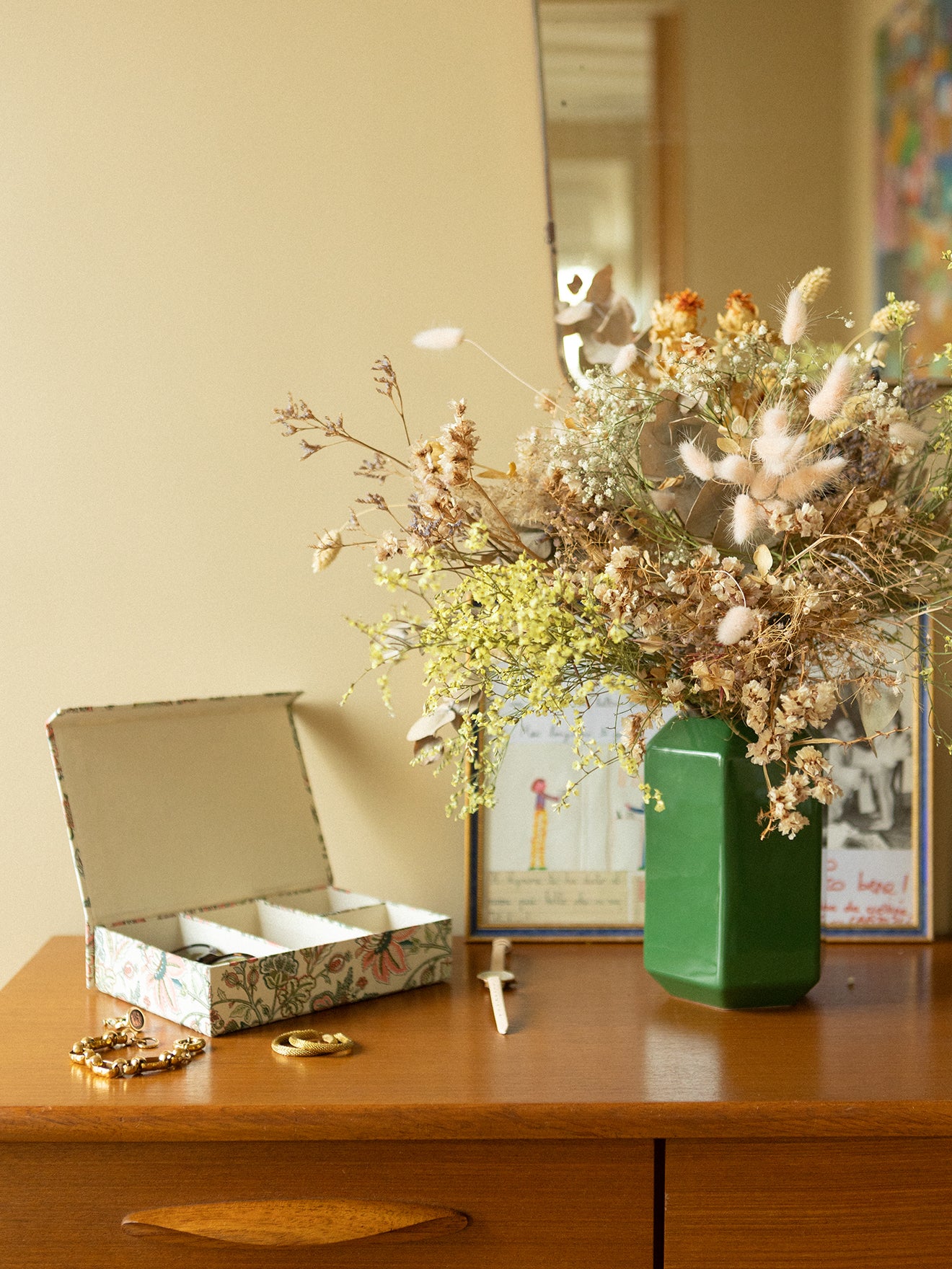 Boîte à bijoux compartimentée avec couvercle rabattable. Boîte en papier cartonné légèrement structuré, imprimé Augustine, fabriquée en Inde de façon artisanale. L’imprimé Augustine est un motif exclusif dessiné par notre équipe de style, il se décline également dans nos collections Linge de lit et Linge de table. 4 compartiments Dim. 21 x 15 x 5 […]