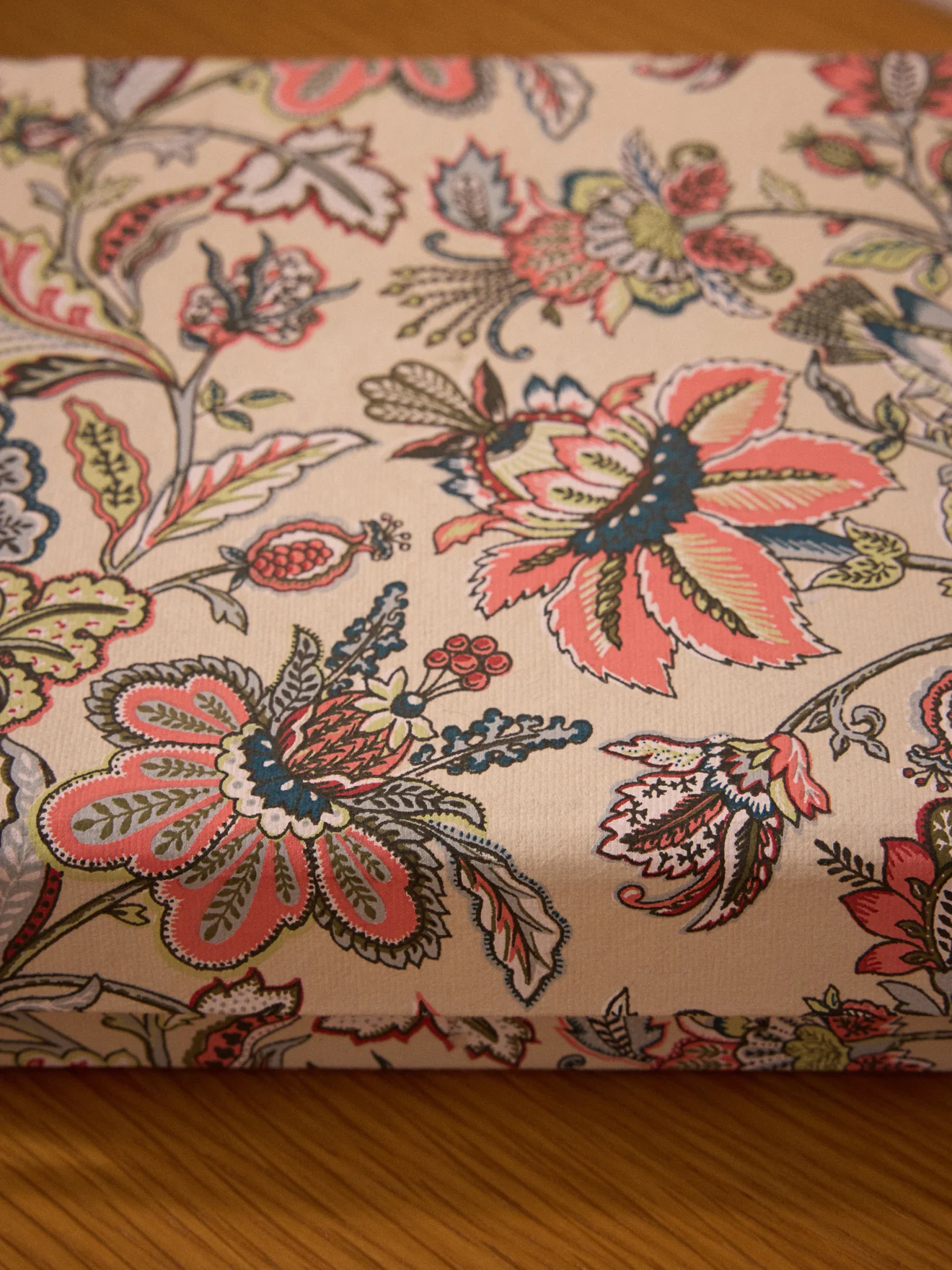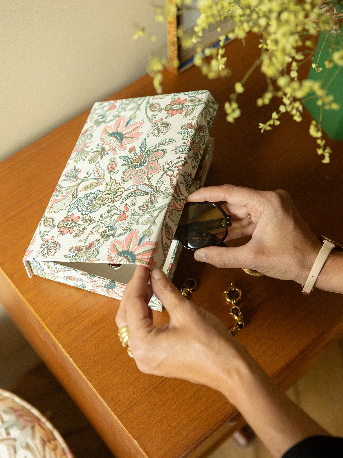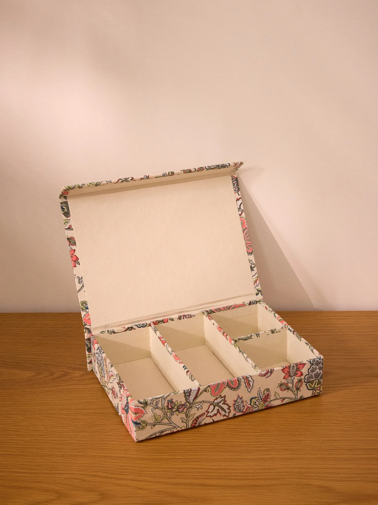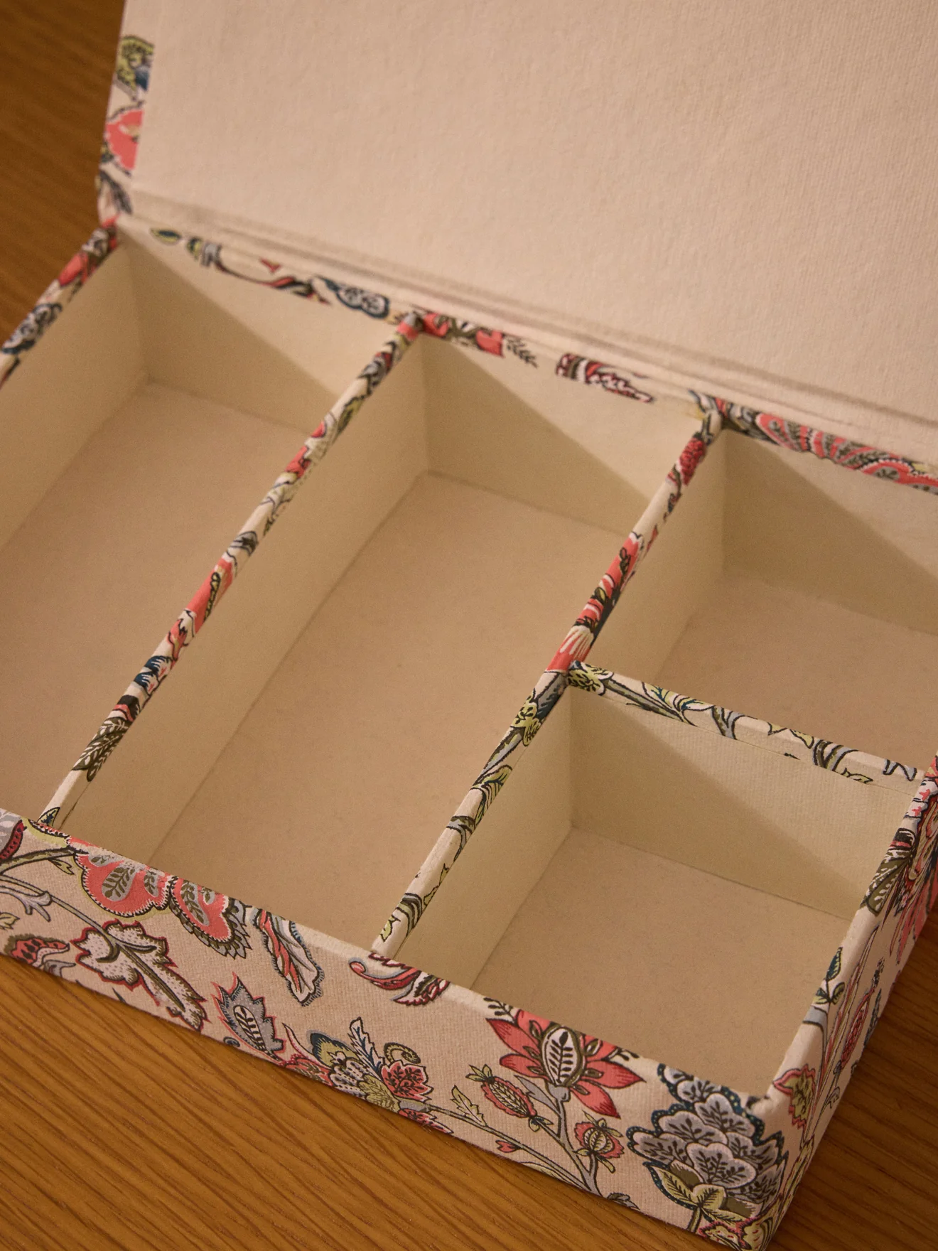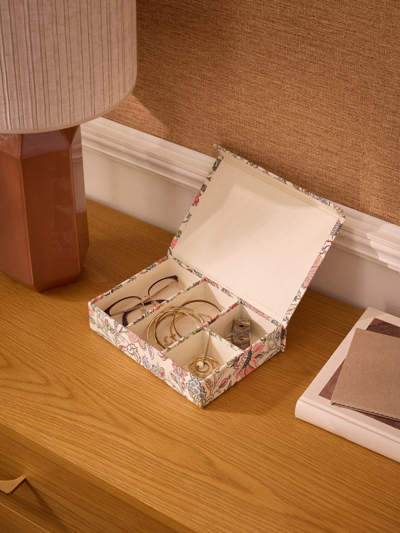 Boîte à bijoux compartimentée avec couvercle rabattable. Boîte en papier cartonné légèrement structuré, imprimé Augustine, fabriquée en Inde de façon artisanale. L’imprimé Augustine est un motif exclusif dessiné par notre équipe de style, il se décline également dans nos collections Linge de lit et Linge de table.