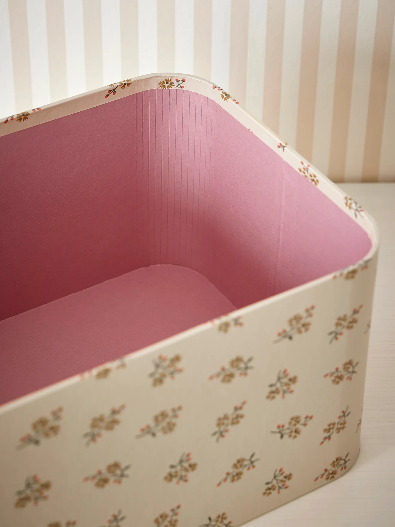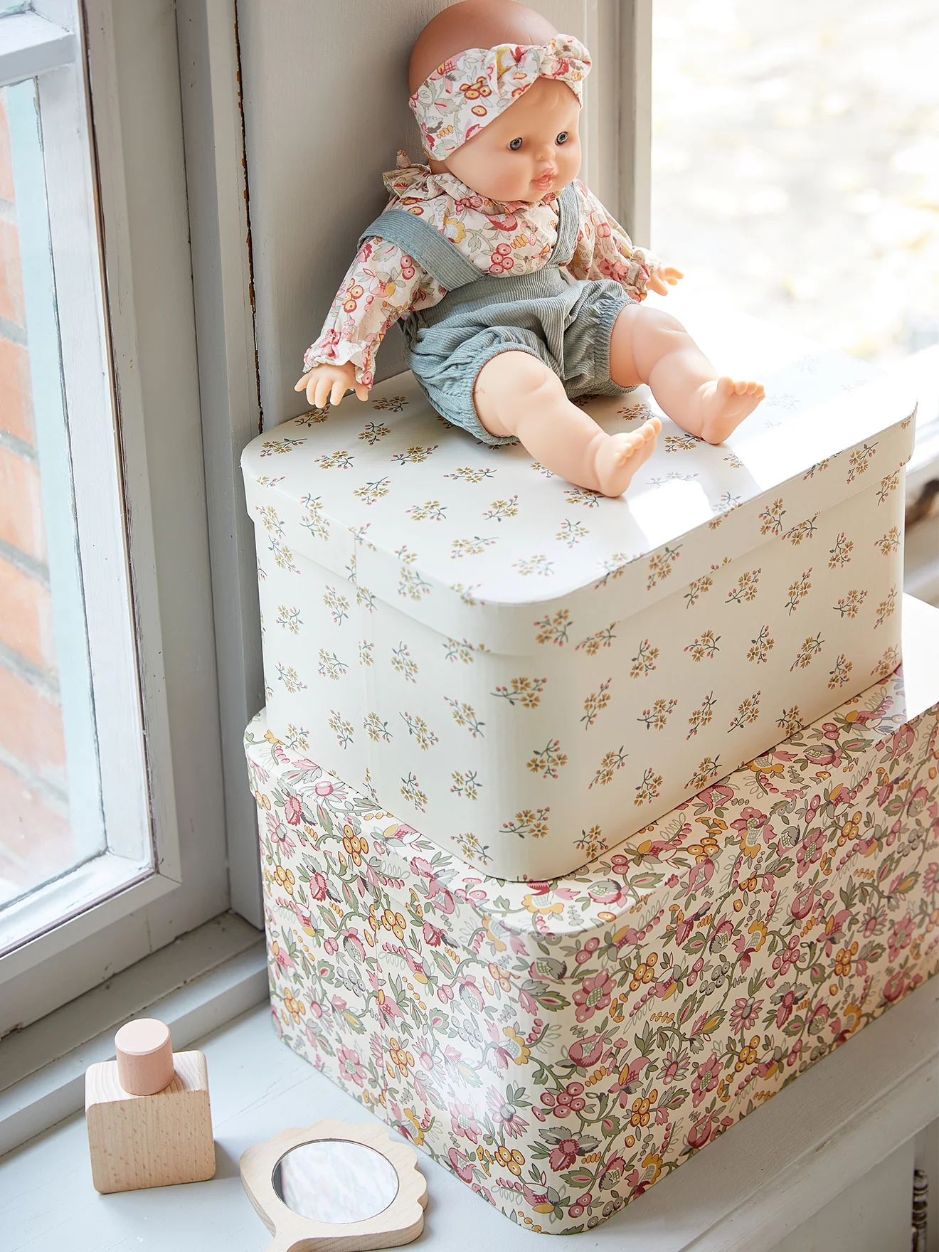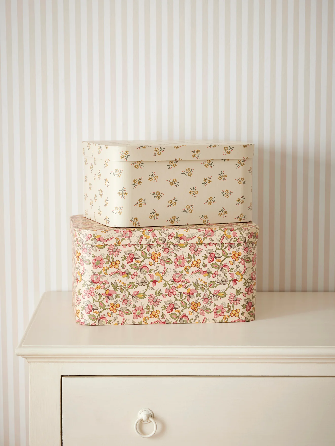Lot de 2 boîtes de rangement, avec couvercle, en papier imprimé légèrement structuré. La plus petite est recouverte de notre imprimé fleuri Kate, la plus grande reprend notre imprimé fleuri Mireille, inspiré d’un tissu ancien. Ces 2 motifs exclusifs, dessinés par les stylistes Cyrillus, sont à retrouver dans nos collections Mode et Maison.
