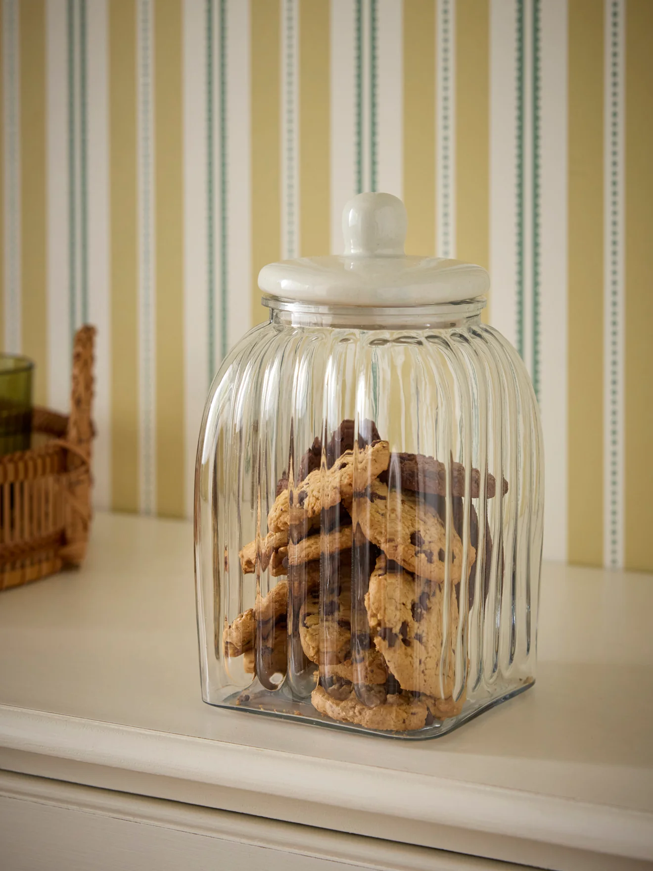 Bonbonnière en verre strié avec couvercle en céramique brillante coloris ivoire. Un rangement au charme d’autrefois, à collectionner dans différentes tailles, pour un usage quotidien dans la cuisine ou la salle de bain. Fabriquée en Inde de façon artisanale. L.12,5 x H.23 x l.12,5 cm environ