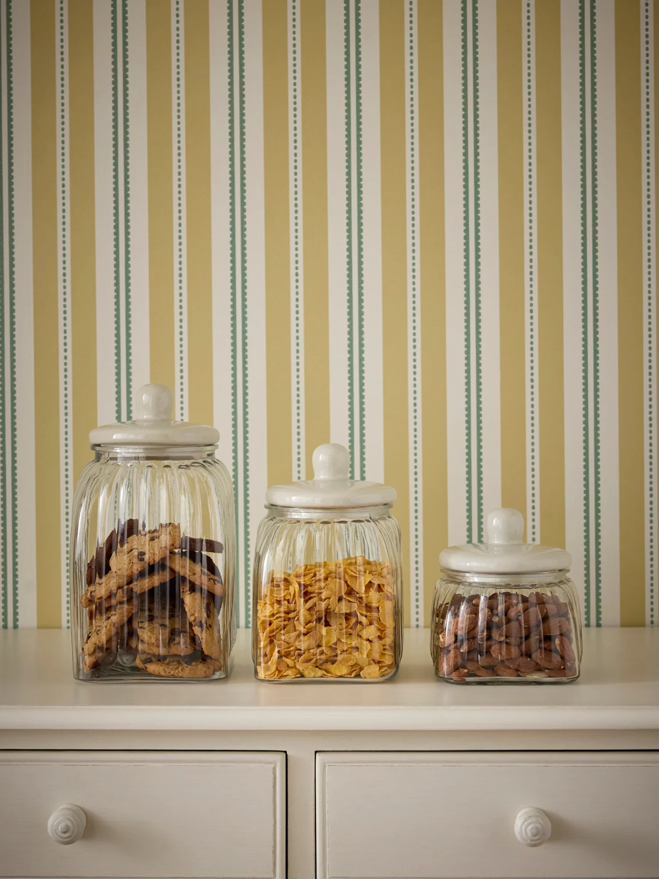 Bonbonnière en verre strié avec couvercle en céramique brillante coloris ivoire. Un rangement au charme d’autrefois, à collectionner dans différentes tailles, pour un usage quotidien dans la cuisine ou la salle de bain. Fabriquée en Inde de façon artisanale.