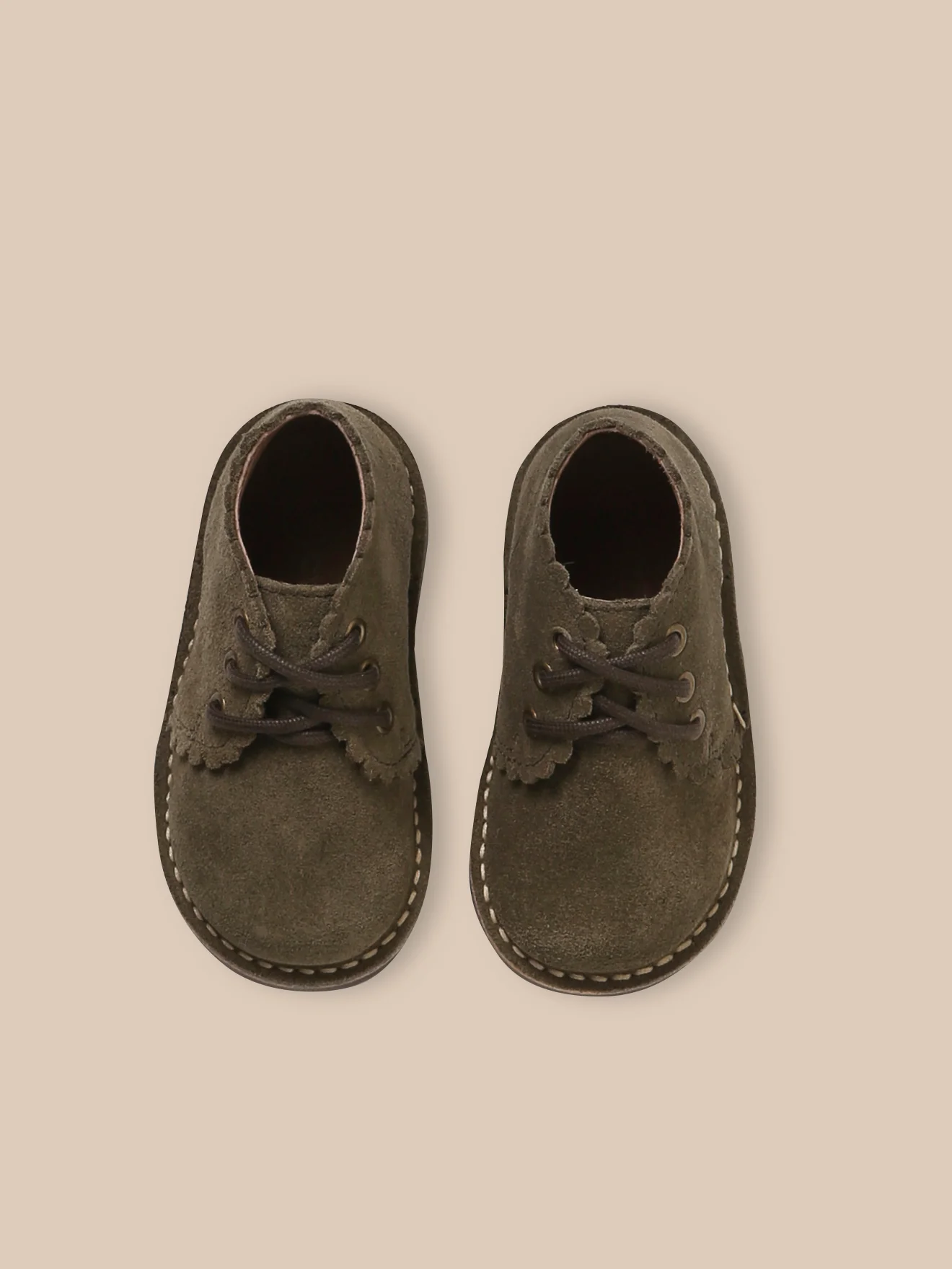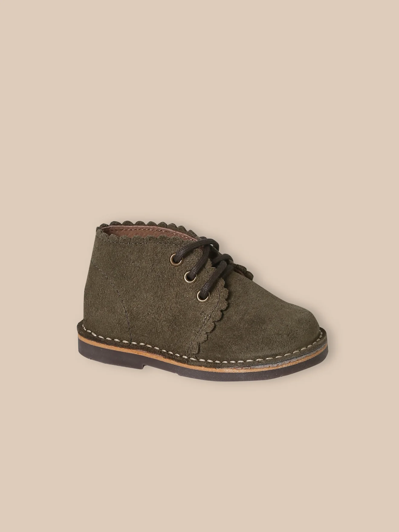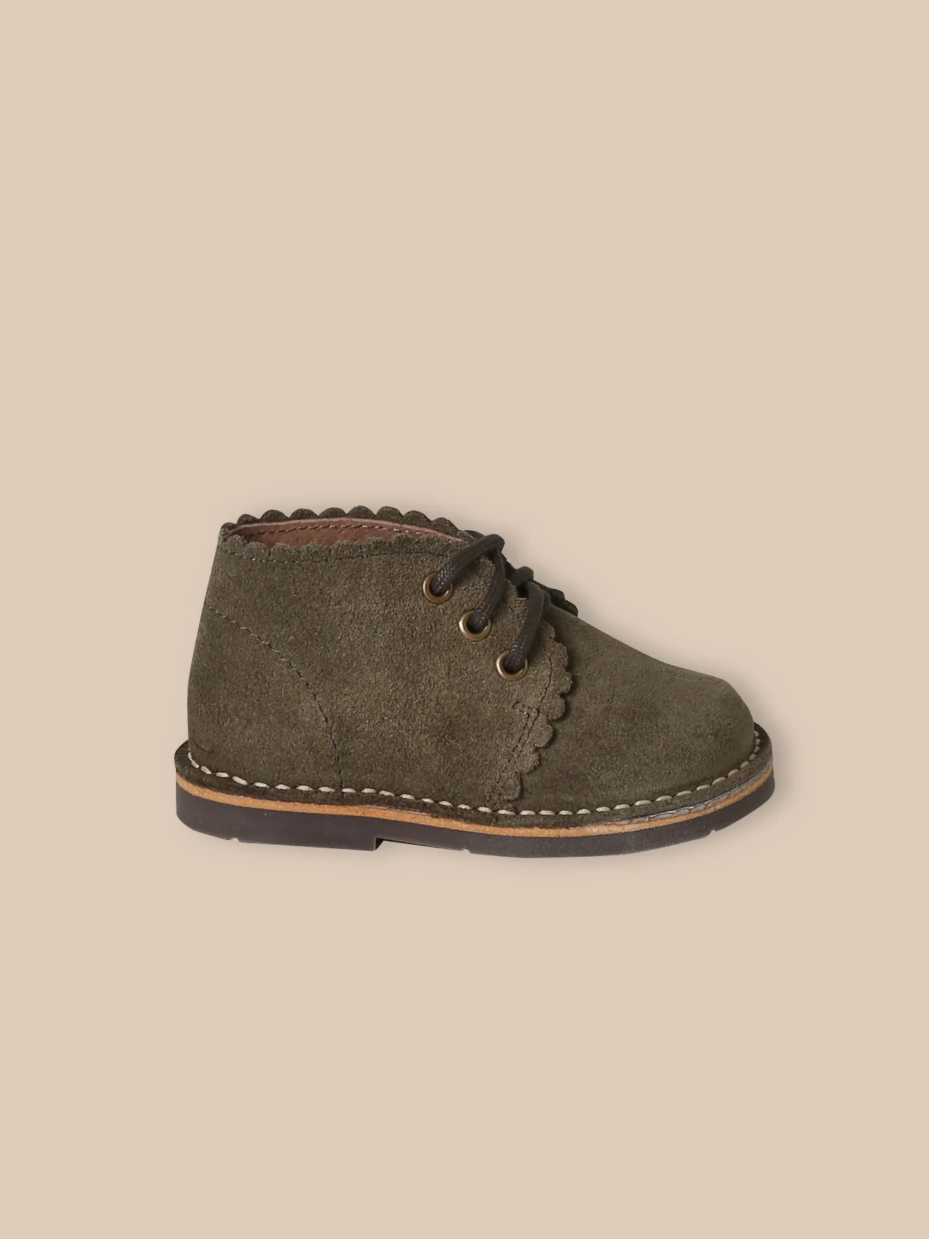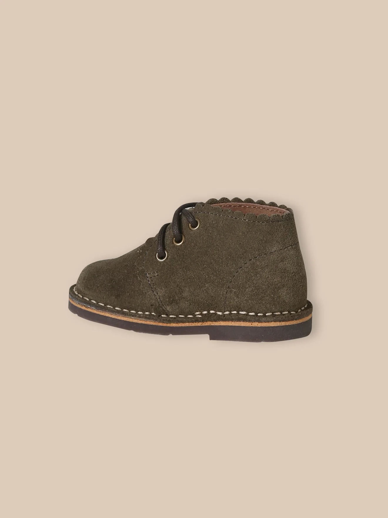 Une chaussure de qualité en cuir suédé pour le confort des petits pieds. Finition festonnée Lacets. Surpiqûres contrastées Fabrication Portugal
