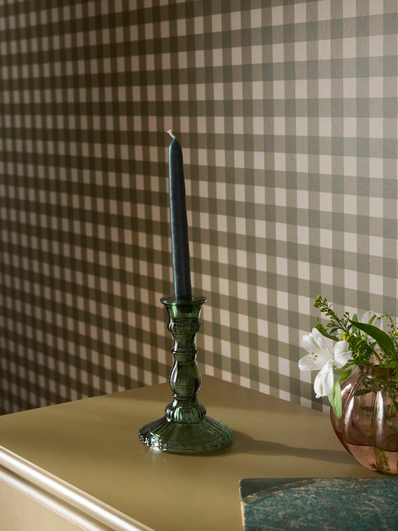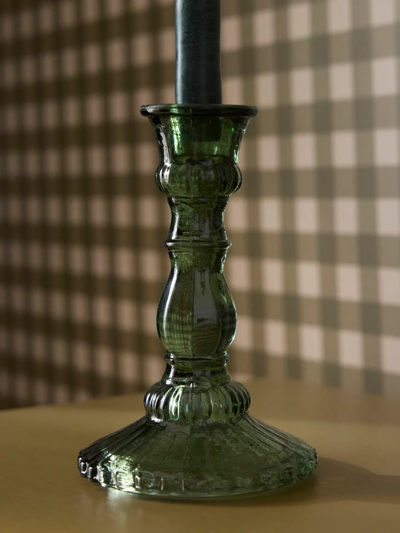 Bougeoir mouluré en verre teinté. Le style classique d’autrefois repensé aux couleurs d’aujourd’hui. Conçu pour accueillir une bougie standard de 2 cm de diamètre.