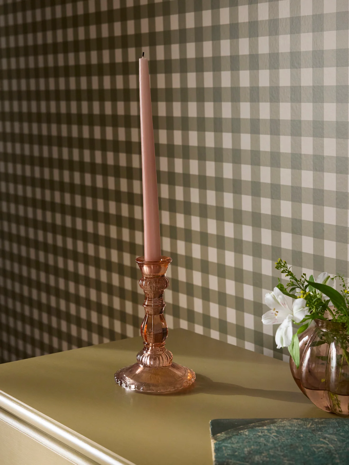 Bougeoir mouluré en verre teinté. Le style classique d’autrefois repensé aux couleurs d’aujourd’hui. Conçu pour accueillir une bougie standard de 2 cm de diamètre.