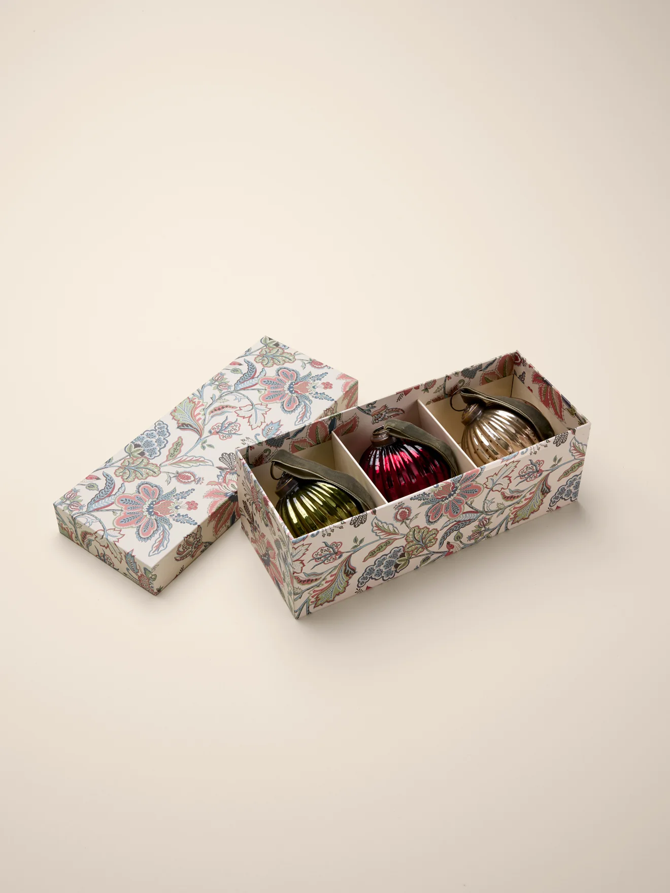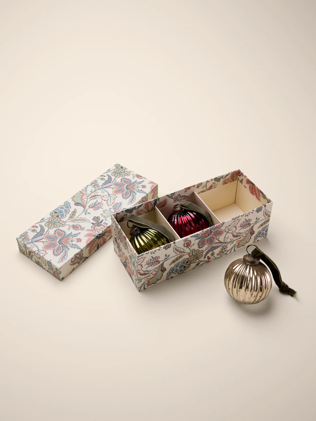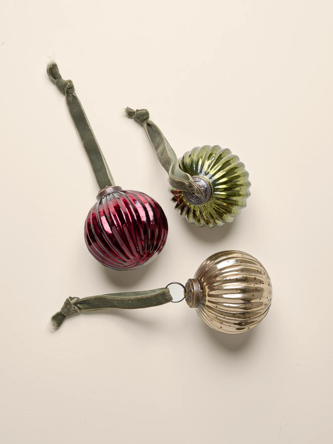 Boules en verre mercurisé avec jeu de stries et ruban en velours vert. Lot de 3 boules de 3 couleurs différentes : rouge foncé, vert sapin et vert lichen. Fabriquées en Inde de façon artisanale. Livrées dans une jolie boîte en papier recouverte de notre imprimé exclusif de Noël.