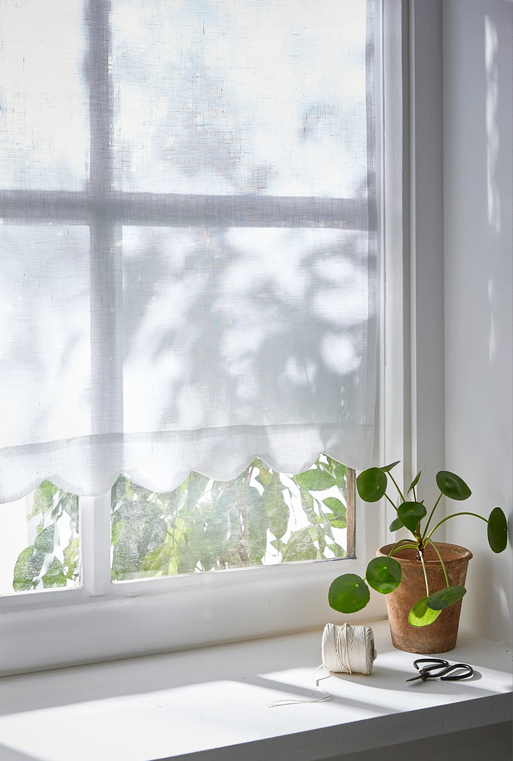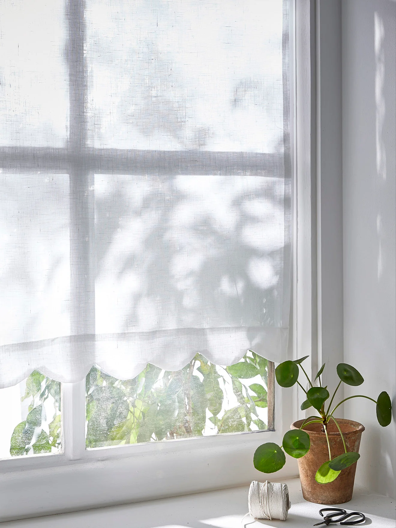 Brise-bise pur lin au tissage délicat et à la confection raffinée. Ouverture tubulaire pour y glisser la tringle. Base festonnée et finition ourlet retourné.