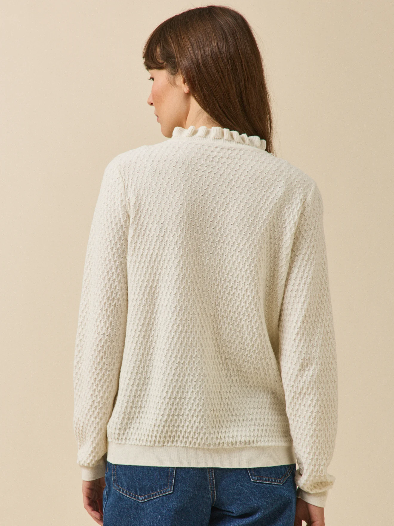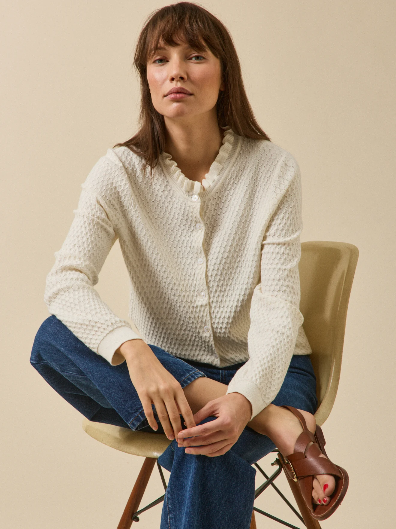Signature Cyrillus, le cardigan se démarque avec ses détails féminins et sa maille précieuse version charme. Une pièce moderne et raffinée, à porter comme un pull à même la peau. Fantaisie volantée en tricot au col rond, patte de boutonnage Finitions par bord-côtes ; long. dos 59 cm (en taille S)