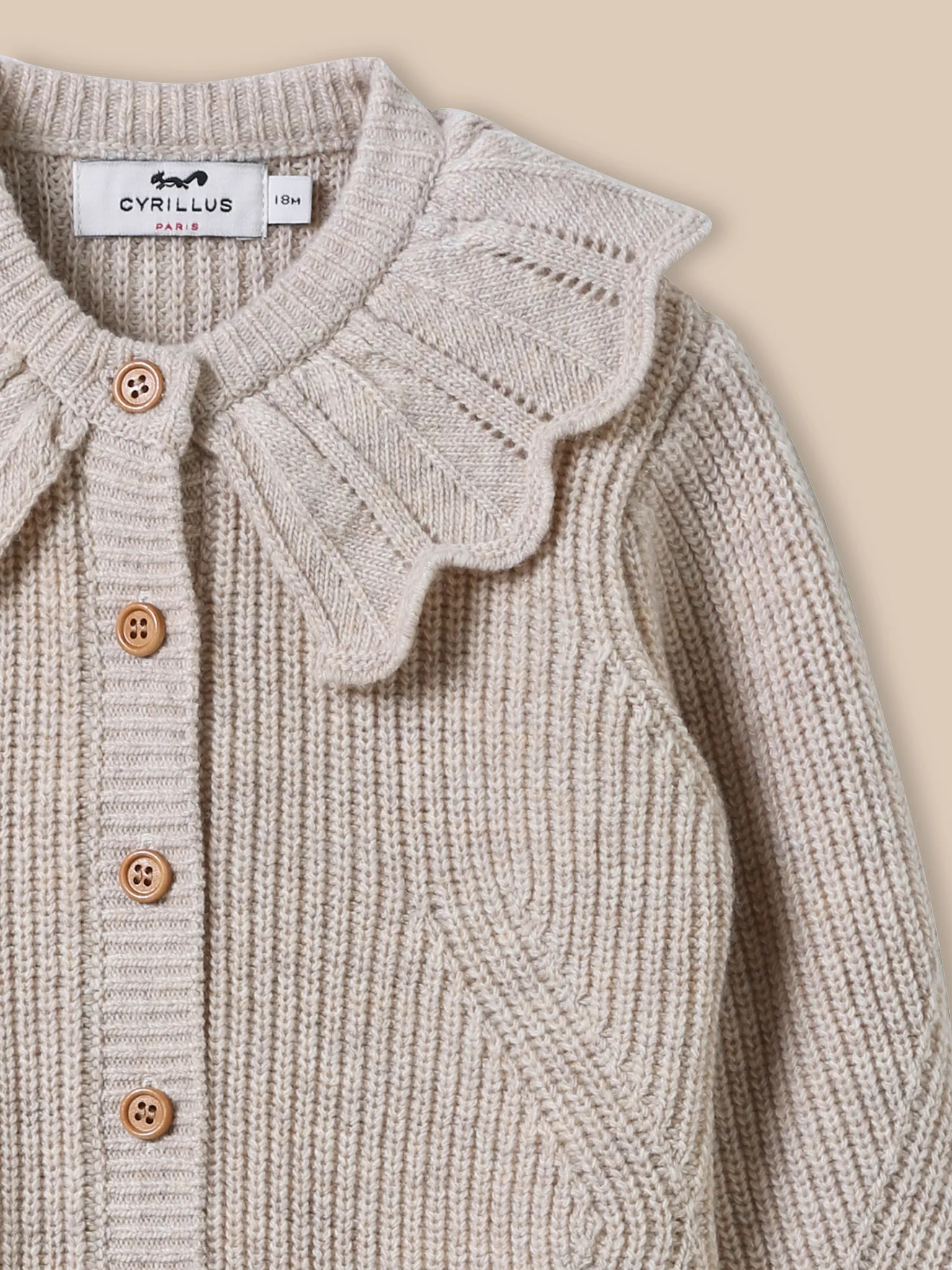 Cet essentiel du vestiaire devient une petite pièce raffinée avec sa collerette et son jeu de point fantaisie. Réalisé dans un tricot réchauffé de laine, ce cardigan se porte dès l’automne. Grande collerette. Jeu d’ajourés Boutons en bois Finition bord-côtes