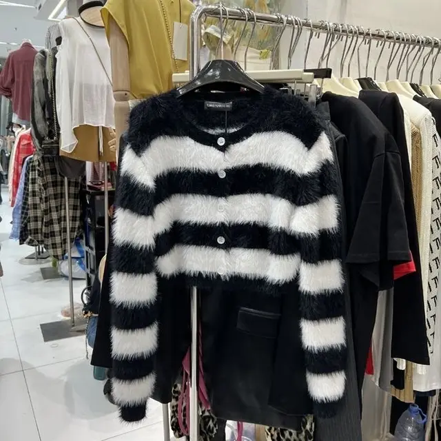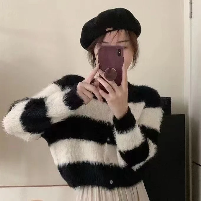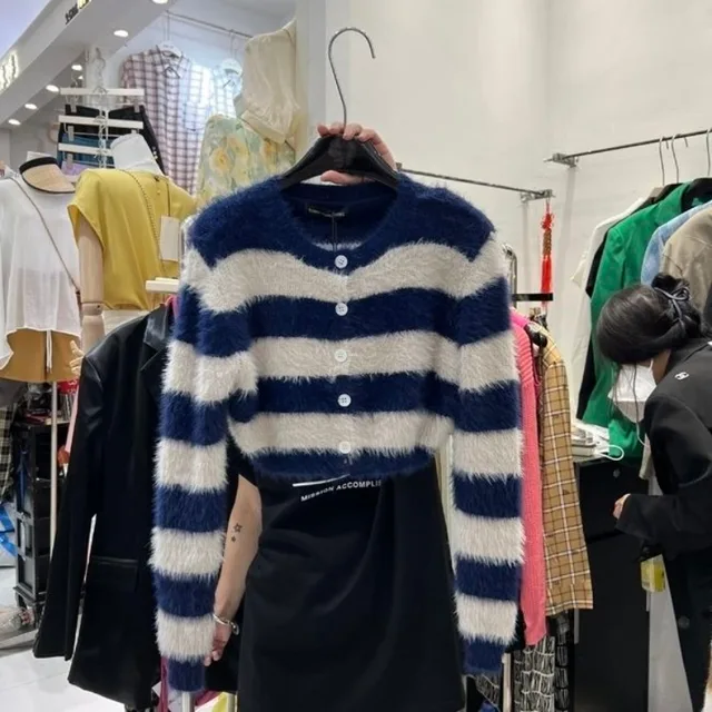 Apportez une touche de style coréen à votre garde-robe avec notre cardigan rayé pour femme. Ce modèle court et doux, avec son col rond, est parfait pour un look décontracté et vintage. 🌟