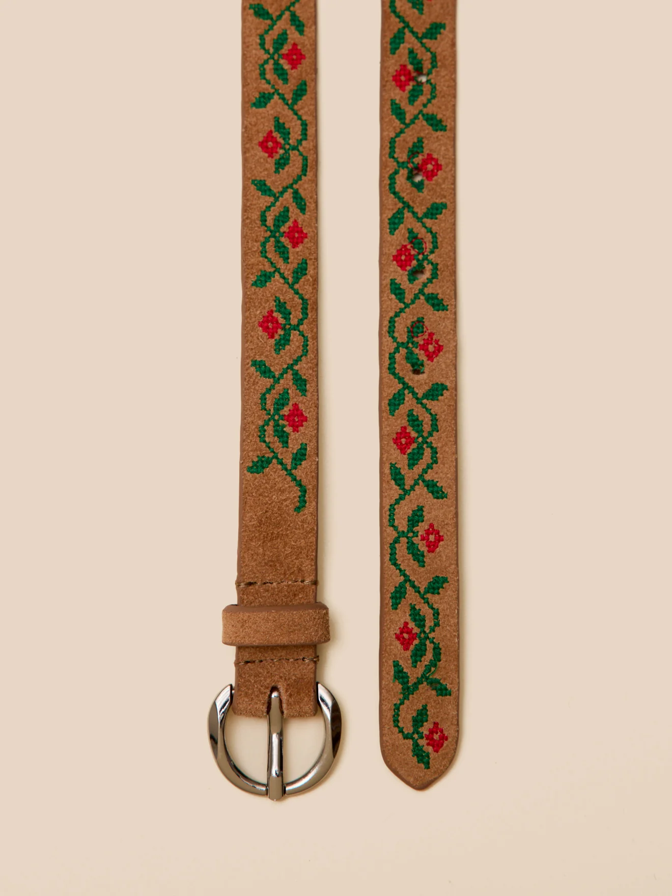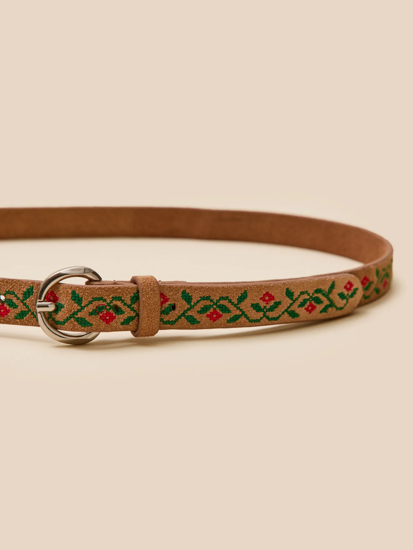 Cette ceinture en cuir entièrement recouverte de fleurs brodées, apporte une touche de poésie à chaque tenue.