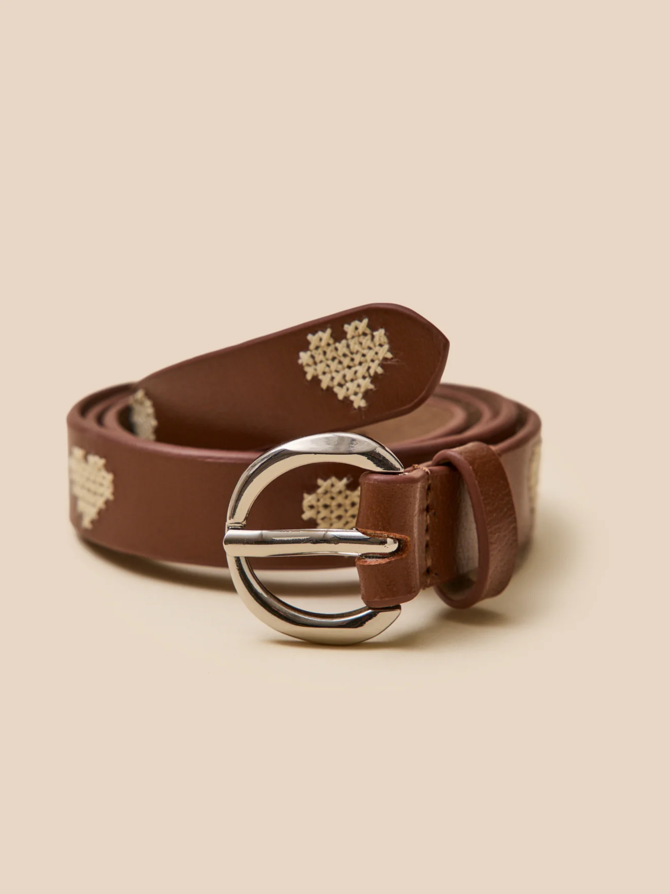 Cette ceinture en cuir entièrement recouverte de coeurs brodés, apporte une touche de poésie à chaque tenue.