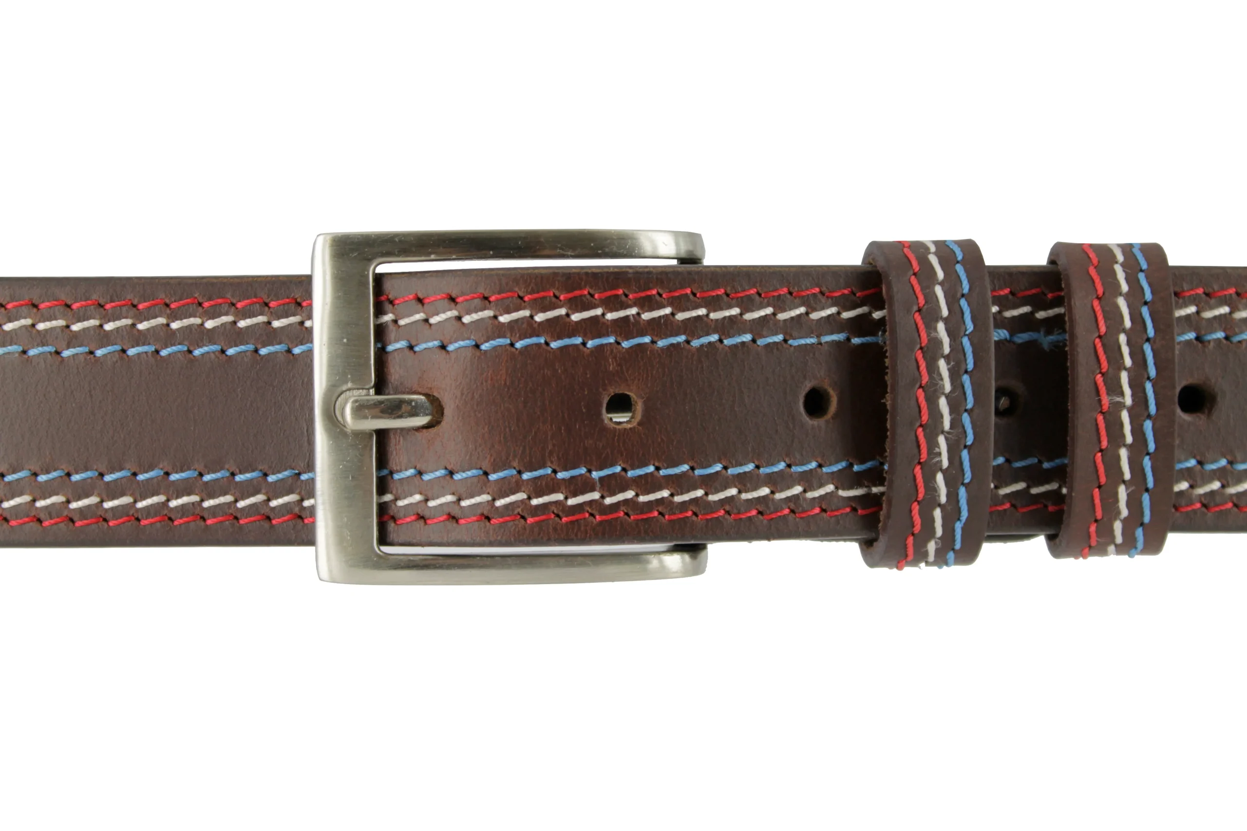 Ceinture en cuir noir avec surpiqûre rouge blanc bleu. Boucle ardillon métal double passant en cuir.