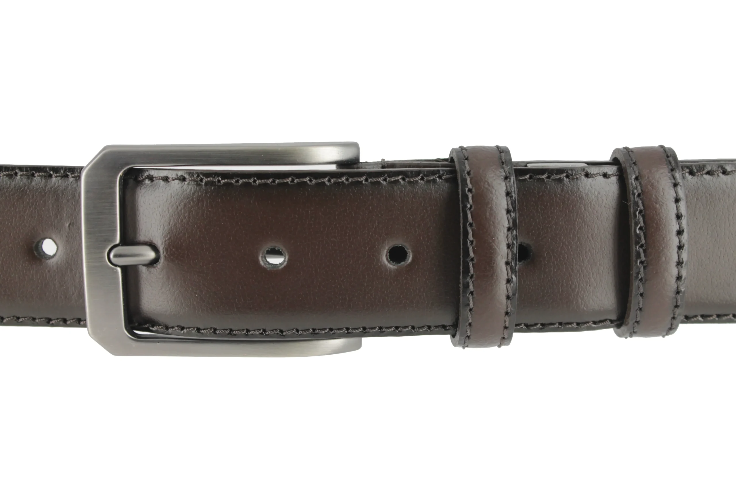 Ceinture en cuir marron foncé. Boucle ardillon métal double passant en cuir.