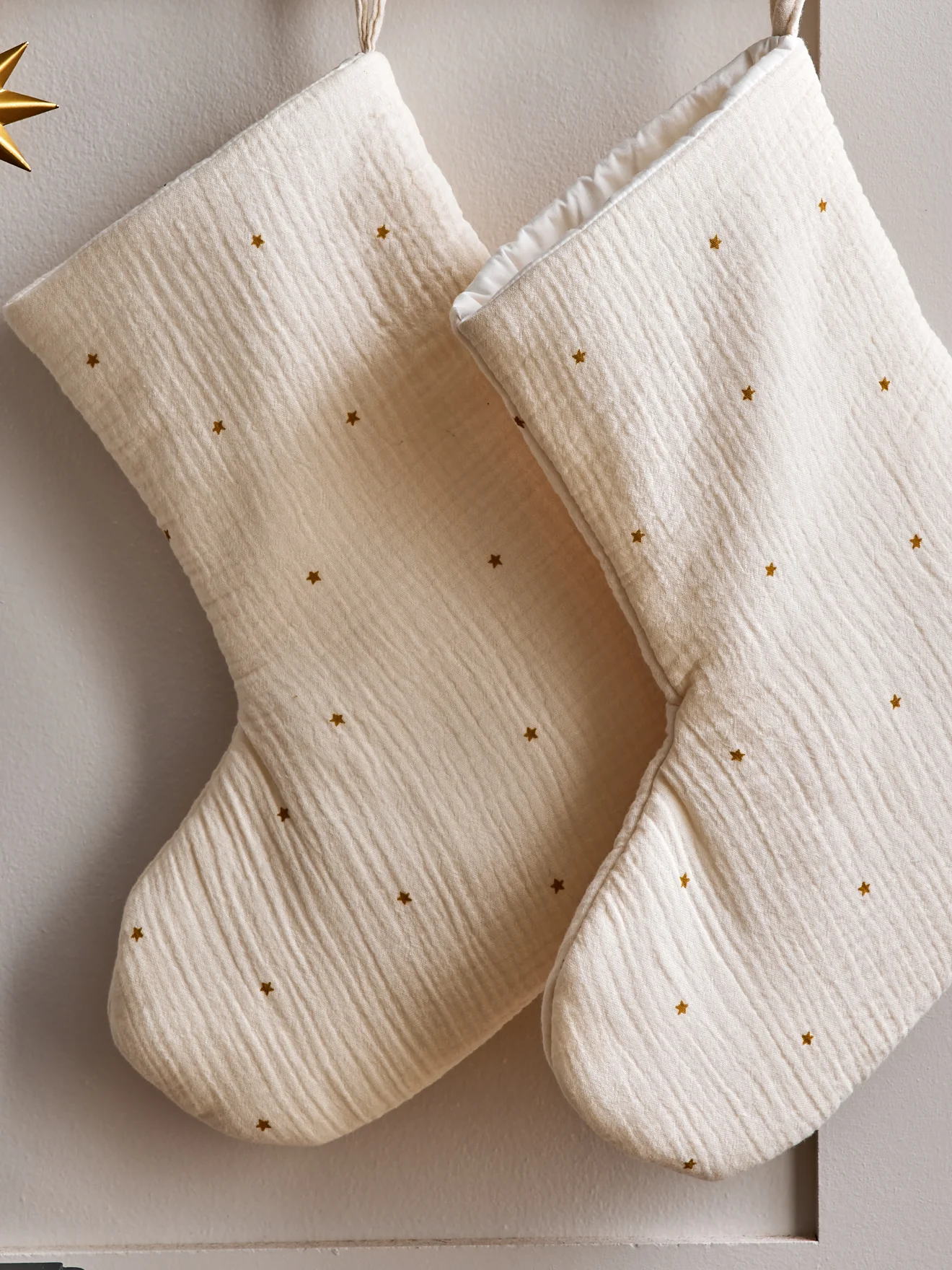 2 chaussettes à suspendre au sapin ou à la cheminée. En gaze de coton imprimée de petites étoiles coloris caramel. Pour une déco de Noël traditionnelle et raffinée.