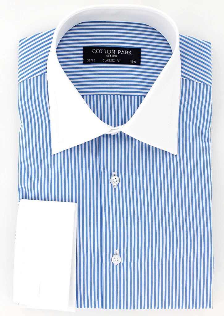 Cette chemise pour homme à fines rayures bleu ciel présente une coupe droite élégante et un col blanc contrastant, de type classique ou français, idéal à porter avec une cravate. Dépourvue de poche pour un style épuré, elle est dotée de baleines intégrées et cousues assurant un maintien impeccable du col tout au long de la journée. Les poignets mousquetaires blancs invitent à l’élégance avec une paire de boutons de manchette ou une passementerie signée Cotton Park.
