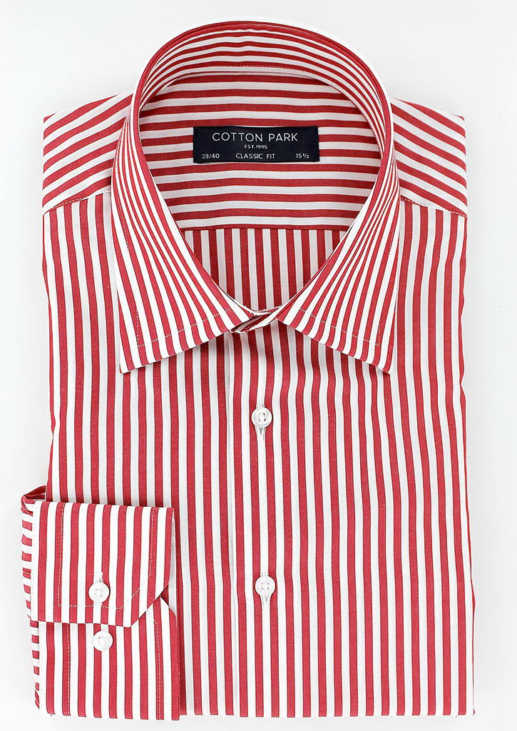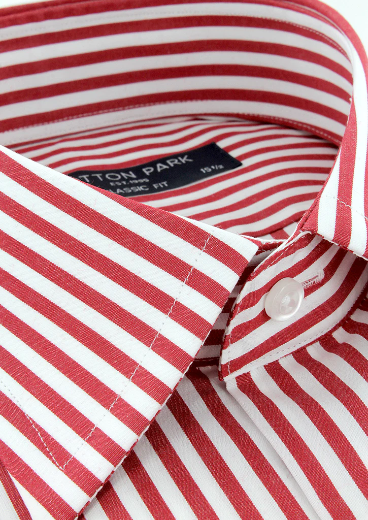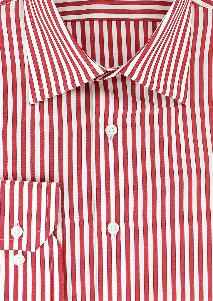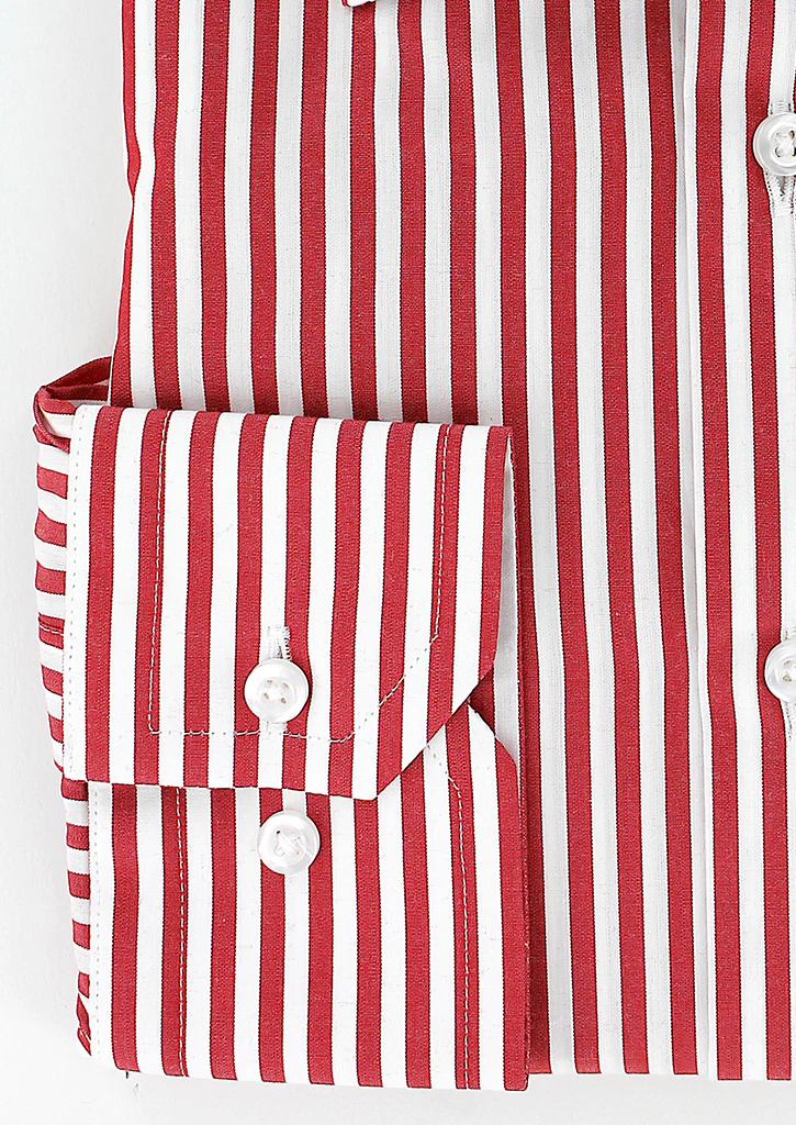 Chemise coupe droite pour homme à rayures bâton rouge. Son col classique ou col français est composé de baleines intégrées afin de conserver sa rigidité dans le temps. Ses manches longues avec poignets boutons réglables permettent de s’adapter avec précision à la largeur des poignets. Cette chemise peut se porter avec ou sans cravate.