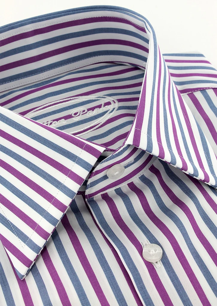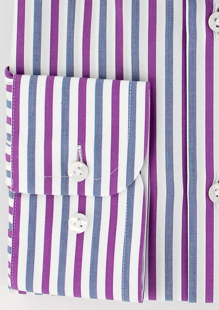 Cette chemise pour homme à coupe droite présente un col classique. Elle est confectionnée à partir d’un tissu en double retors, agrémenté de rayures bleues et fuchsia. Cette chemise pour homme haut de gamme à été conçue en manches longues avec poignets simples réglables.