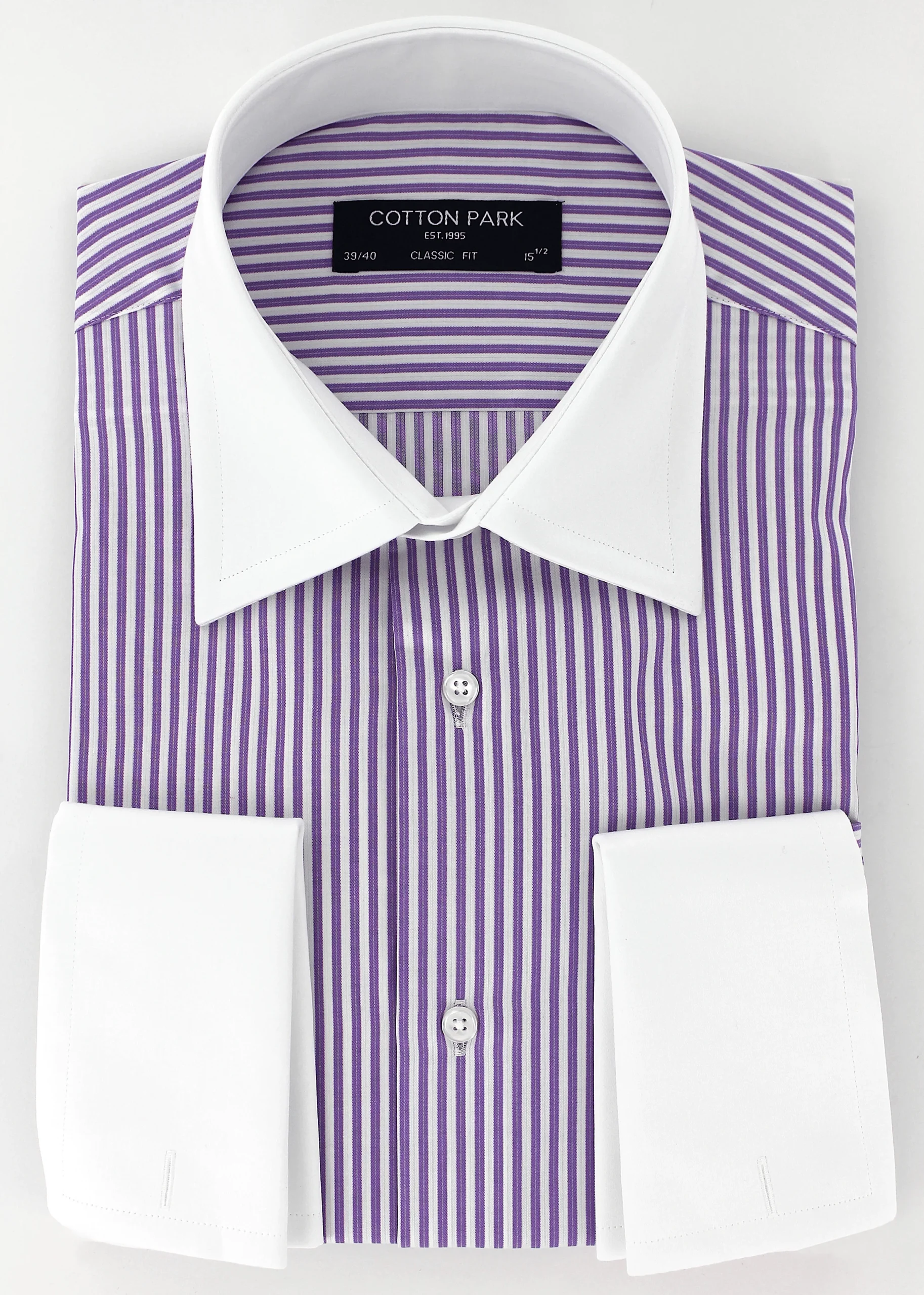 Chemise pour homme coupe droite à col blanc Cotton Park à rayures parmes. Cette chemise manches longues sans poche possède un col classique ou français parfait pour l’accompagner d’une jolie cravate. La rigidité du col est conservée grâce à deux baleines intégrées et cousues. Cette chemise devra se porter avec une jolie paire de boutons de manchette ou passementerie Cotton Park.