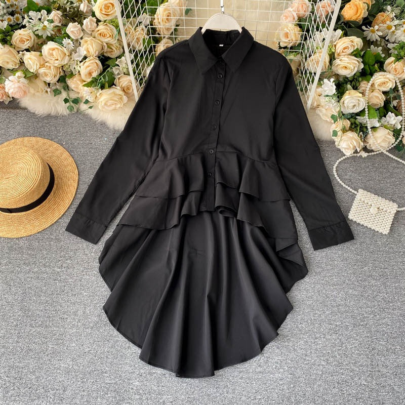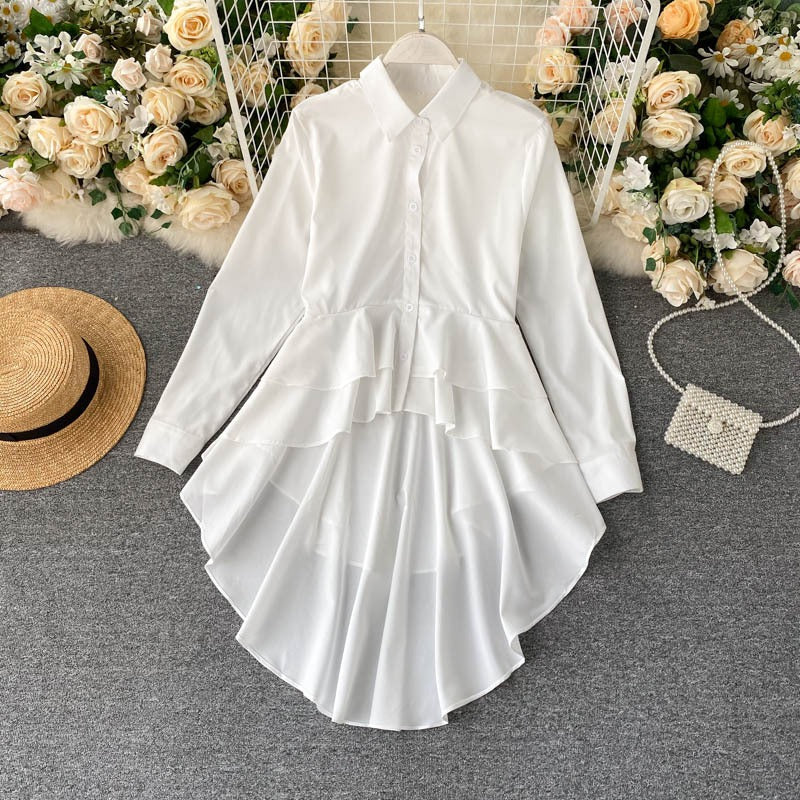 Adoptez un look élégant et décontracté avec notre chemise asymétrique à volants. Parfaite pour un style académique et chic, cette chemise à manches longues et col polo est un incontournable de la mode coréenne. 🌟