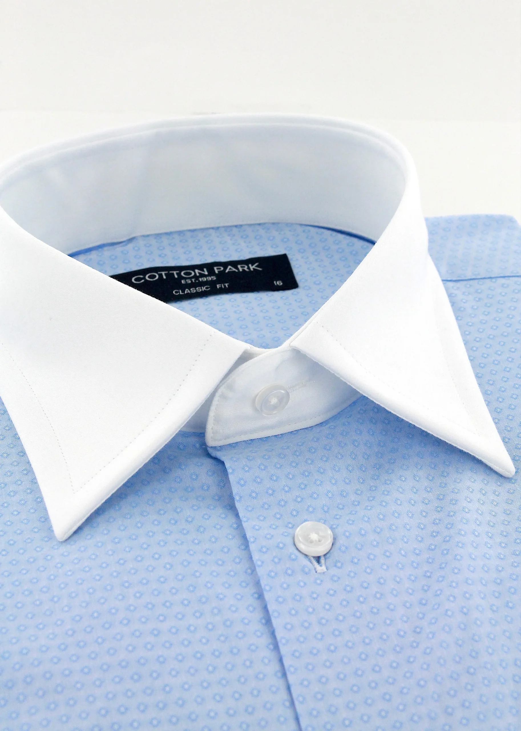 égante et raffinée, cette chemise pour homme à coupe droite séduit par son motif bleu ciel discret et son col blanc contrastant, de type classique ou français, idéal pour accompagner une cravate en soie Cotton Park. Sans poche, elle présente une silhouette nette et épurée. Le col est renforcé par deux baleines intégrées et cousues, assurant un maintien parfait dans le temps.