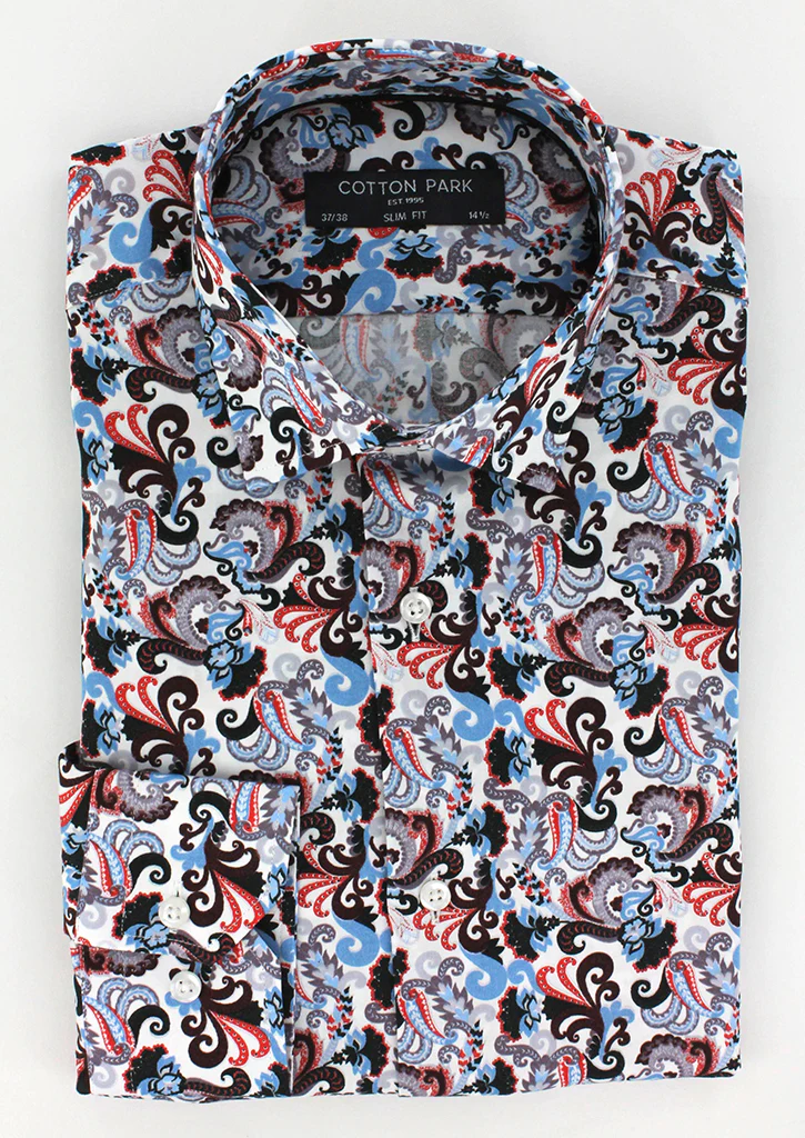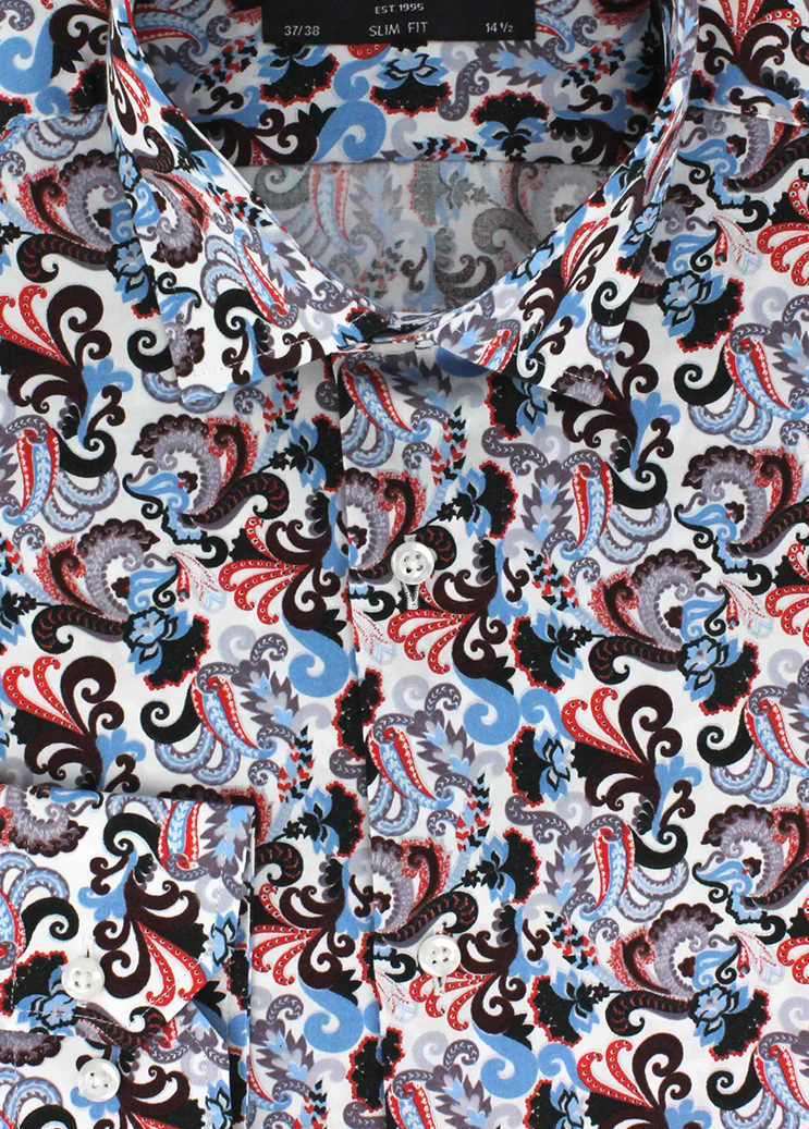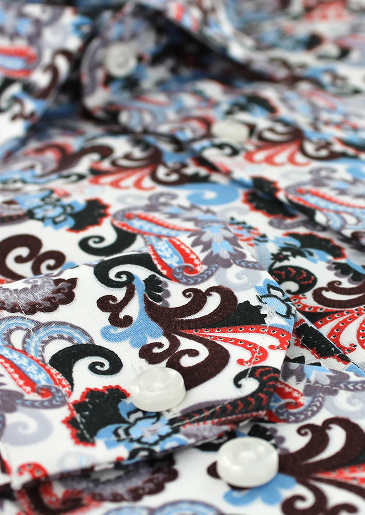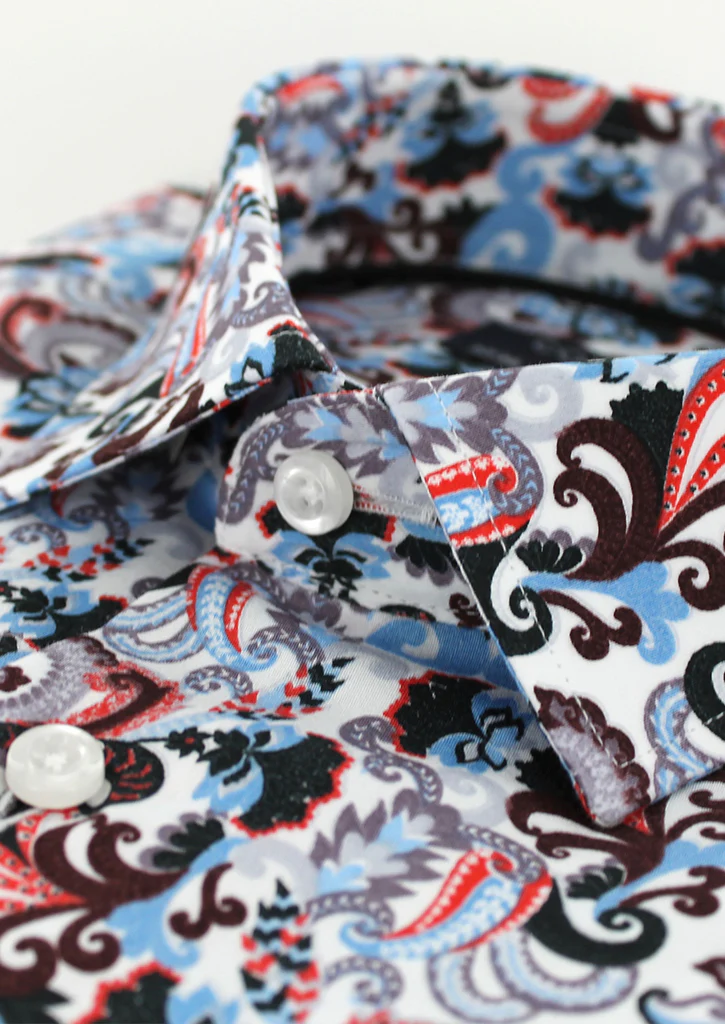 Cette chemise en 100% coton vous est proposée en coupe cintrée avec des imprimés cachemire rouge. La chemise est proposée avec un petit col italien avec baleines intégrées.