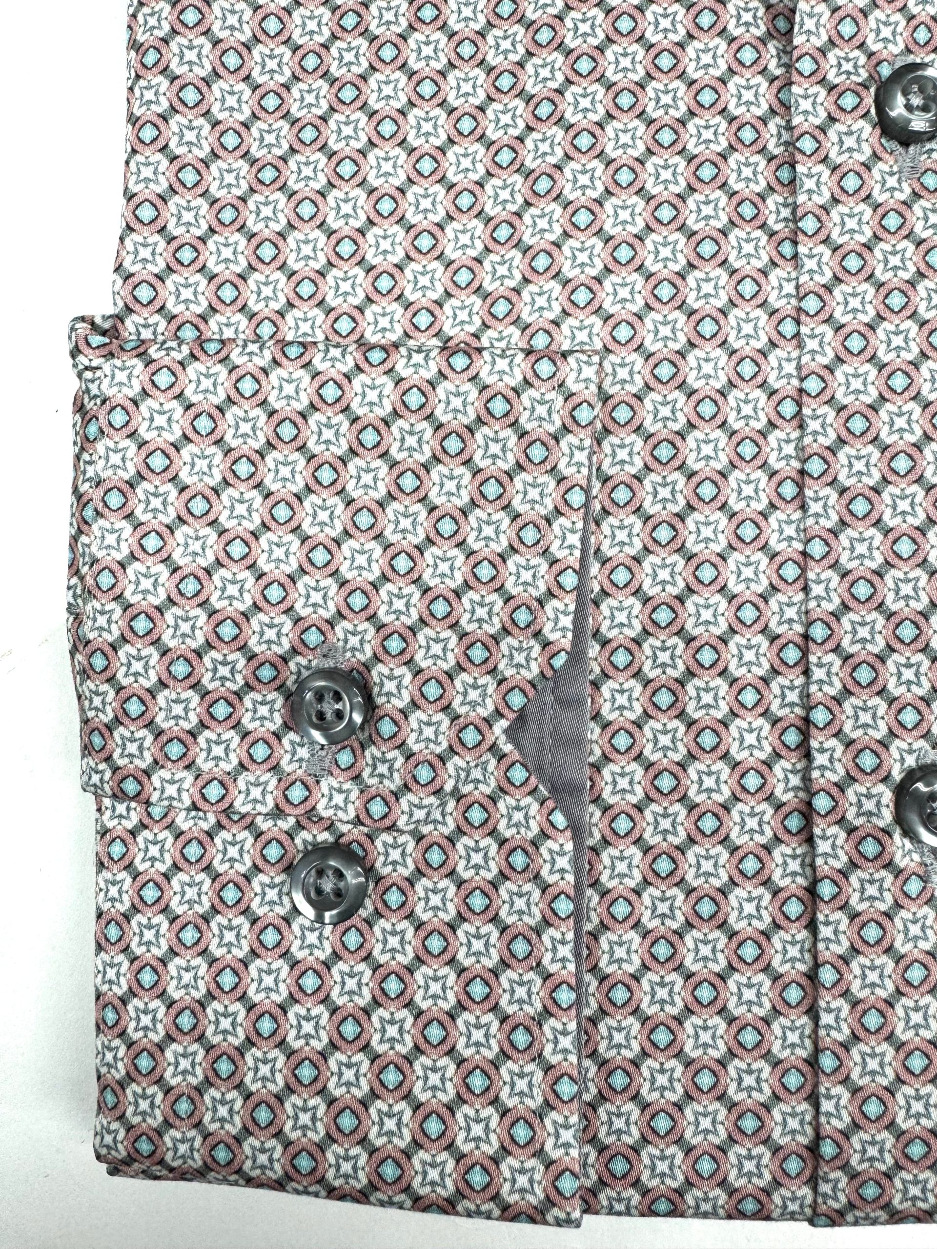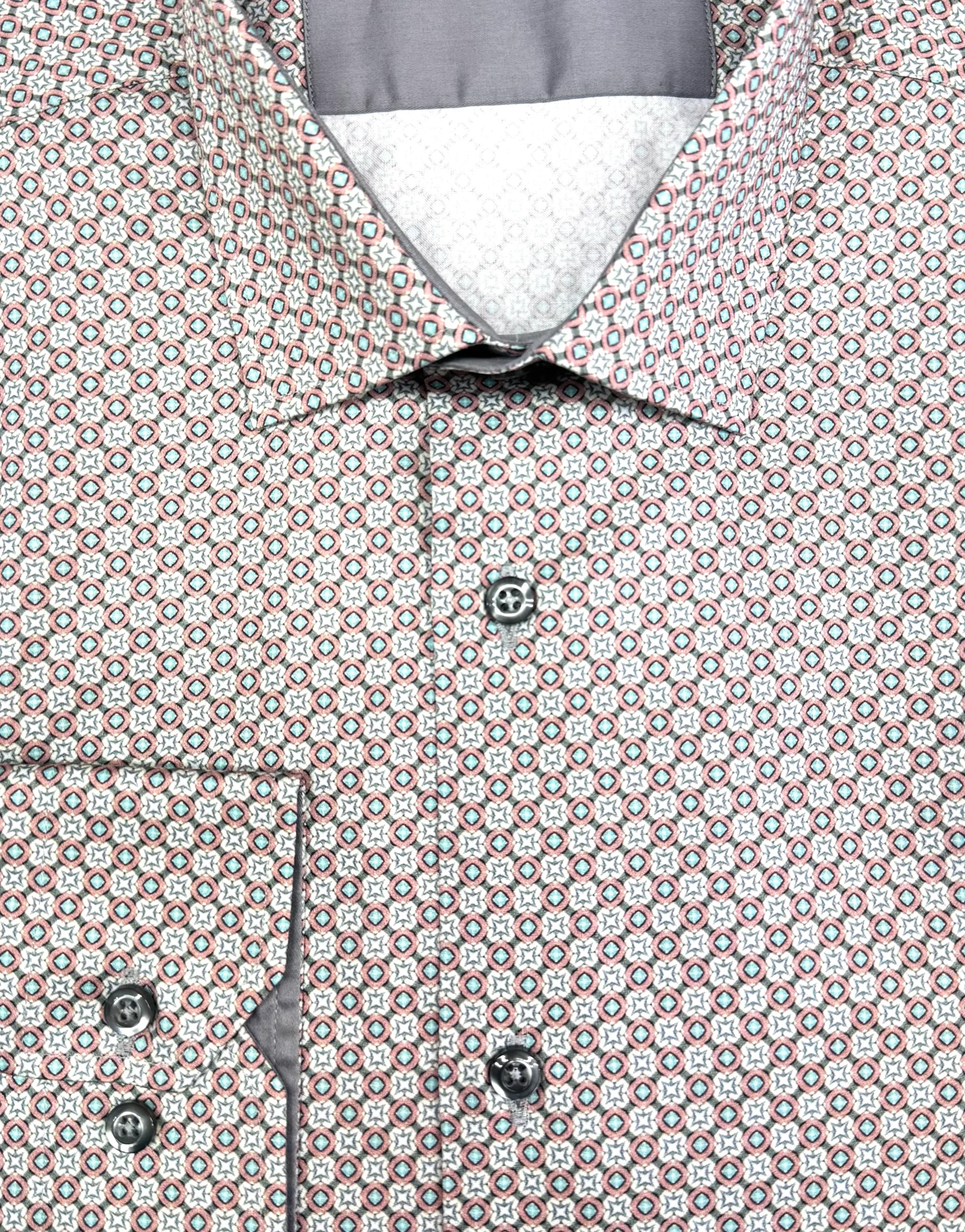 Cette chemise imprimée est en manches longues avec des poignets simples et réglables avec deux boutons.
