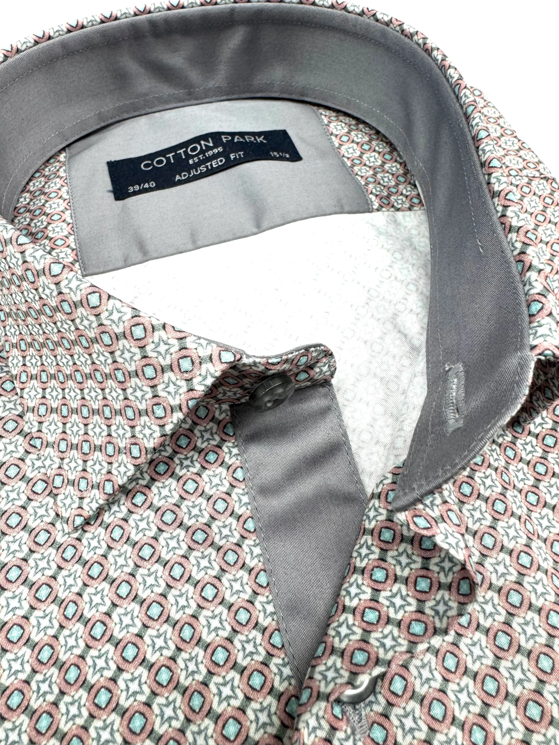 Cette chemise en 100% coton vous est proposée en coupe cintrée avec des imprimés beige et gris. La chemise est proposée avec un petit col italien avec opposition unie de couleur grise. Chemise avec baleines intégrées.