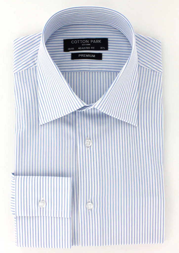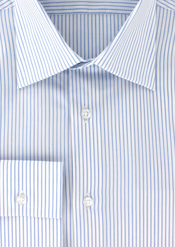 Chemise à fines rayures bleu ciel col et poignets mousquetaires blancs