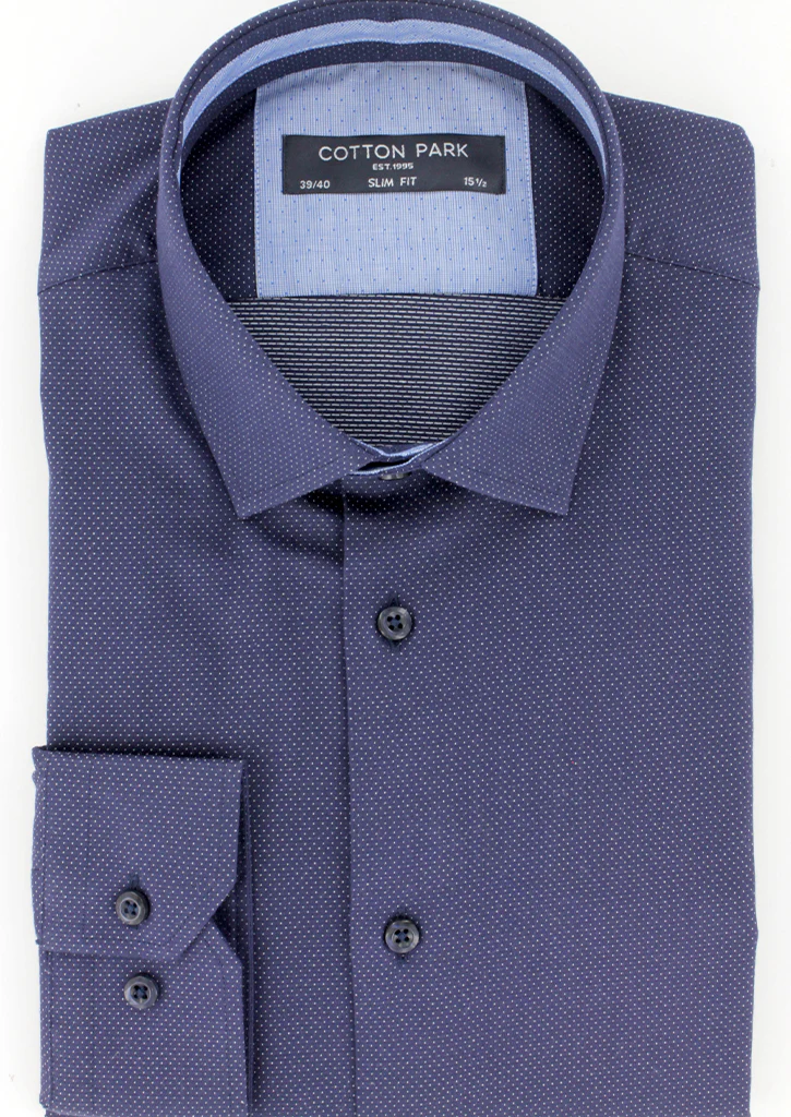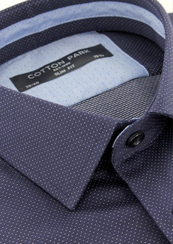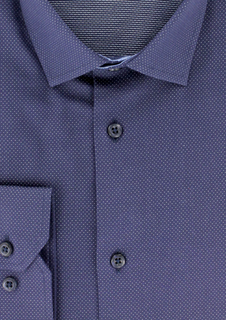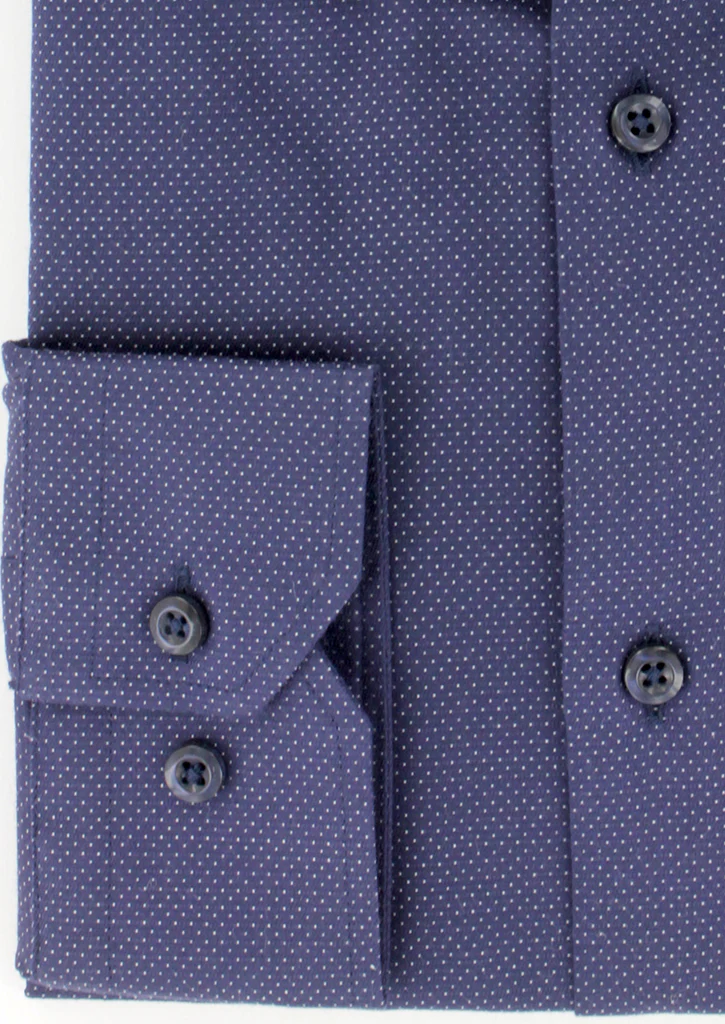 Chemise coupe cintrée pour homme fabriquée en 100% coton bleu marine à pois blancs. Son petit col est composé de baleines intégrées afin de conserver sa rigidité dans le temps. Ses manches longues avec poignets simples réglables permettent de s’adapter avec précision à la largeur des poignets. Chemise avec opposition bleu ciel au pied de col, gorge et poignets.