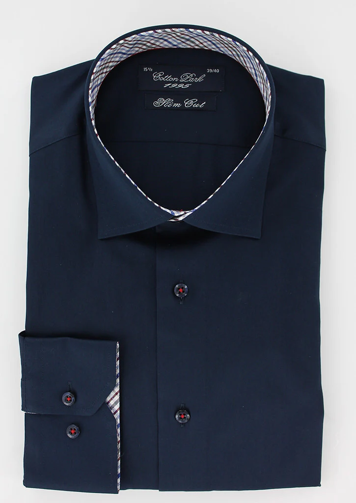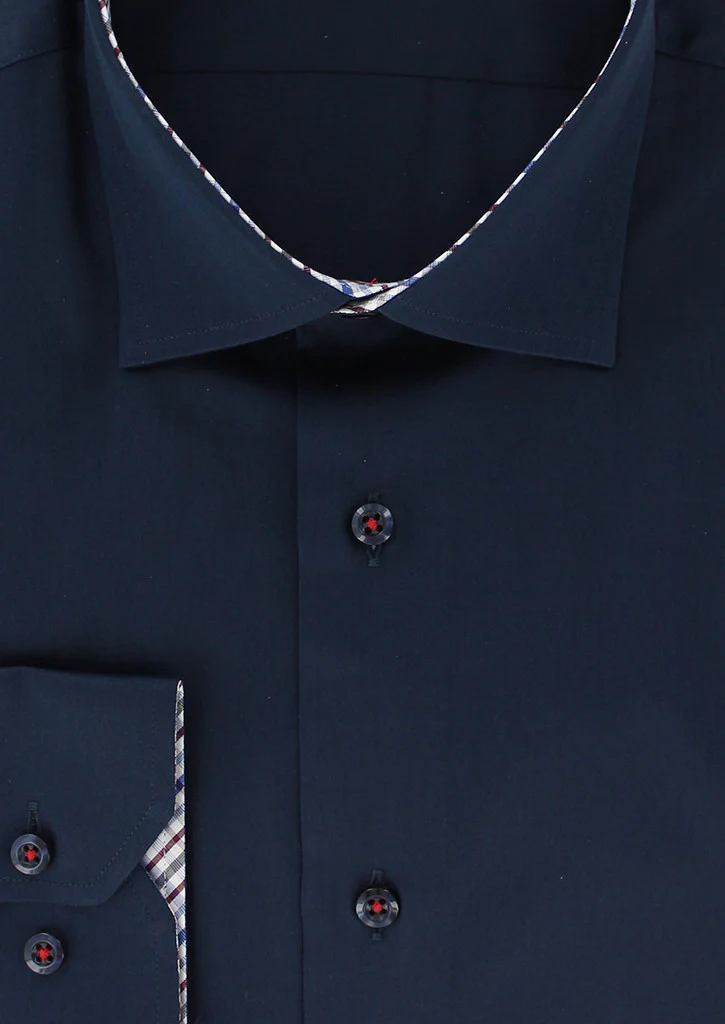 Chemise coupe cintrée pour homme fabriquée en coton bleu marine avec une opposition à petits carreaux au niveau du col, des poignets et de la gorge. Son petit col est composé de baleines intégrées afin de conserver sa rigidité dans le temps. Ses manches longues avec poignets boutons réglables permettent de s’adapter avec précision à la largeur des poignets. Cette chemise peut se porter avec ou sans cravate.
