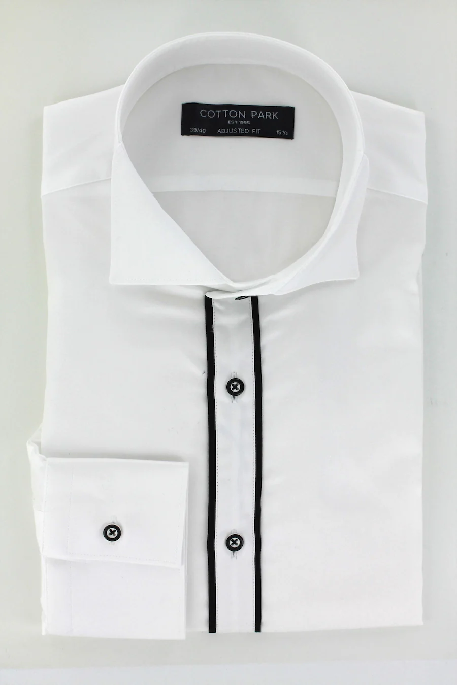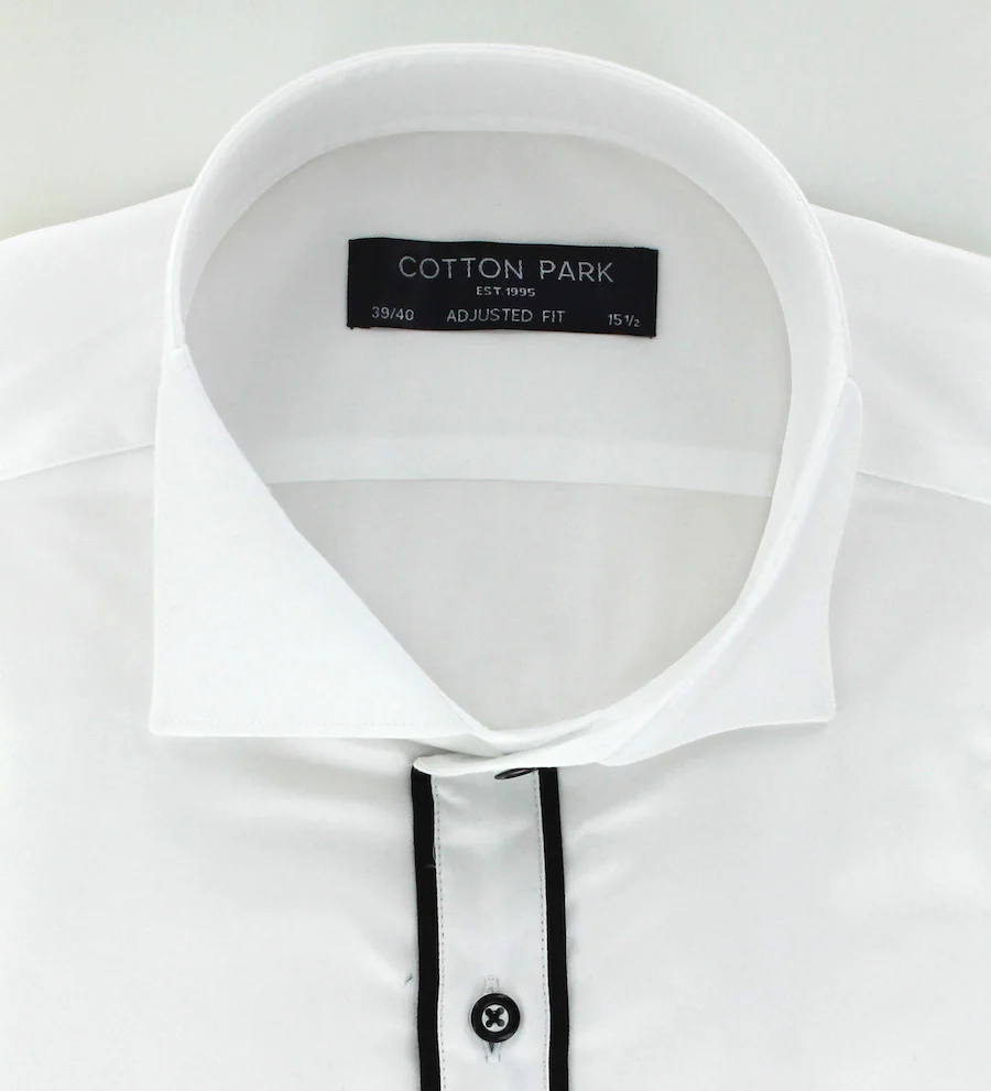 Chemise de cérémonie Cotton Park pour homme en satin de coton blanc. Cette chemise en coupe cintrée à manches longues possède un col cassé ainsi qu’un biais noir au niveau de la gorge.