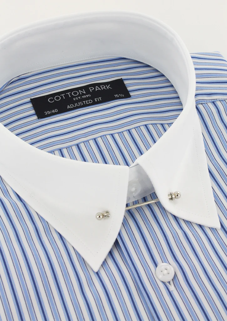 Chemise coupe ajustée pour homme à rayures bleues, fabriquée avec un col anglais à barrette de couleur argent. Ses manches longues avec poignets à boutons réglables permettent de s’adapter avec précision à la largeur des poignets. Le col anglais assure une bonne tenue de la cravate tout au long de la journée.